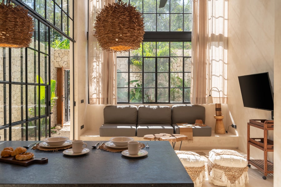 Casa Nómade is a 1600 sq ft / 140 sq mt boho-chic hideaway in La Veleta, tucked in a quiet boutique gated community near vibrant Calle 7. Unwind in your private jungle garden, a refreshing plunge pool with water cascade, and a built-in lounge for shaded afternoons. Inside, spacious areas meet handcrafted indigenous design. Enjoy a king bed, indulgent Yucatán Senses bath products, and high-speed Wi-Fi.