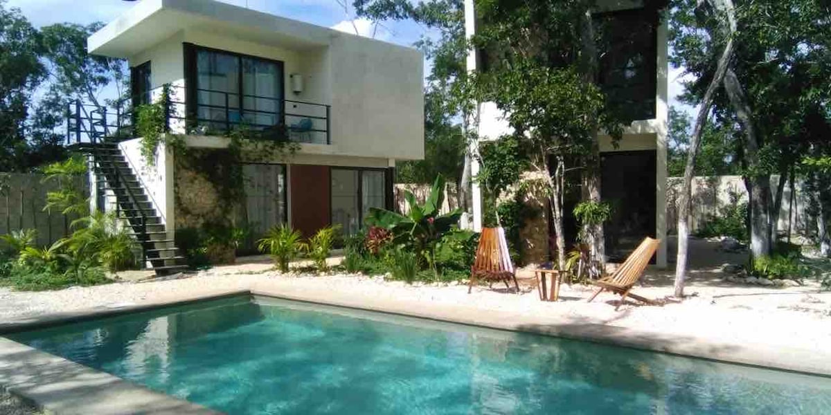 Luminoso y moderno apartamento de 2 dormitorios y 2 baños con vistas a la selva, con una piscina ENORME (con zona de piscina para niños), terraza privada, cocina totalmente equipada e internet de fibra óptica de alta velocidad. Este es el lugar perfecto para relajarse antes o después de un día en la playa o en las ruinas. Ideal para familias o amigos que buscan alojamiento moderno en Tulum. También es una gran oficina remota para aquellos a los que les gusta trabajar y viajar (¡además de todas las demás cafeterías y restaurantes increíbles para trabajar!).