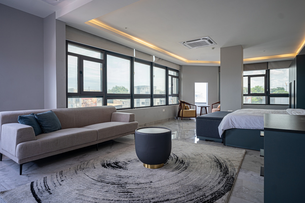 ¡Descubre un oasis moderno en Acra! Este elegante estudio se encuentra frente a la Feria Internacional de Comercio de Ghana, a solo 12 minutos a pie de la playa y a 15 minutos en coche del aeropuerto. Ideal para viajeros solos, parejas o profesionales de negocios que buscan una base limpia, elegante e increíblemente conveniente para explorar la ciudad. Ofrece una cocina pequeña, WiFi rápido, aire acondicionado, calentador de agua, TV inteligente, asientos al aire libre y estacionamiento. ¡Disfruta de comodidad y conveniencia en un ambiente agradable!