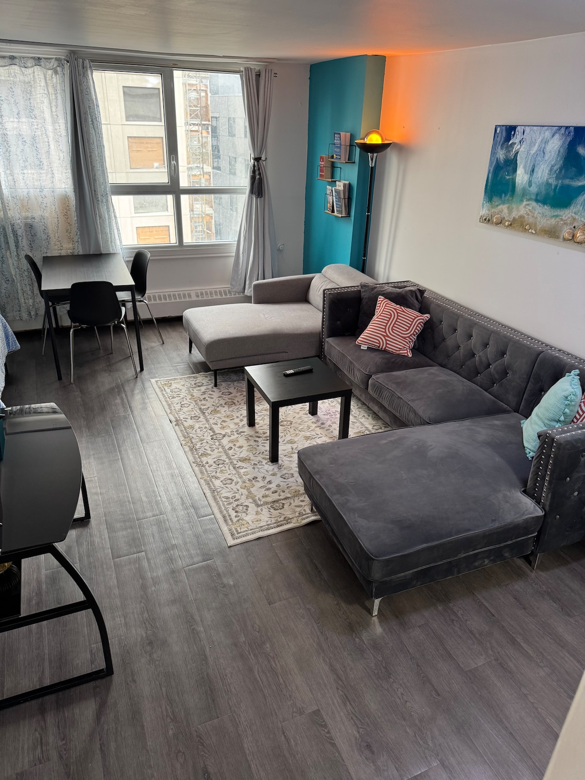 ¡Apartamento situado en pleno centro de la ciudad con acceso directo al Bell Center! Disfruta de tu estancia con lujo y comodidad en un apartamento de un dormitorio totalmente amueblado que incluye café, tostadora, hervidor de agua y todos los utensilios de cocina gratuitos. ¡Sauna, piscina, gimnasio con numerosas pesas y máquinas, salón panorámico, sala de juegos, salón y terraza con múltiples barbacoas a tu disposición! ¡Disfruta de un aparcamiento subterráneo gratuito y de un acceso a 1 minuto al sistema de metro sin tener que poner un pie fuera! Netflix incluido.
