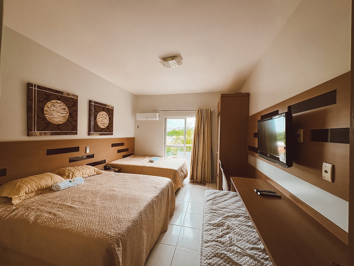 Diviértete con toda la familia en este lugar lleno de estilo. ¡Hermoso apartamento en un resort maravilloso! Tiene capacidad para hasta siete personas. Hay dos dormitorios, uno de ellos es una suite con aire acondicionado; sala de estar con TV y aire acondicionado; cocina equipada con nevera, microondas, platos, vasos y cubiertos; balcón gourmet.