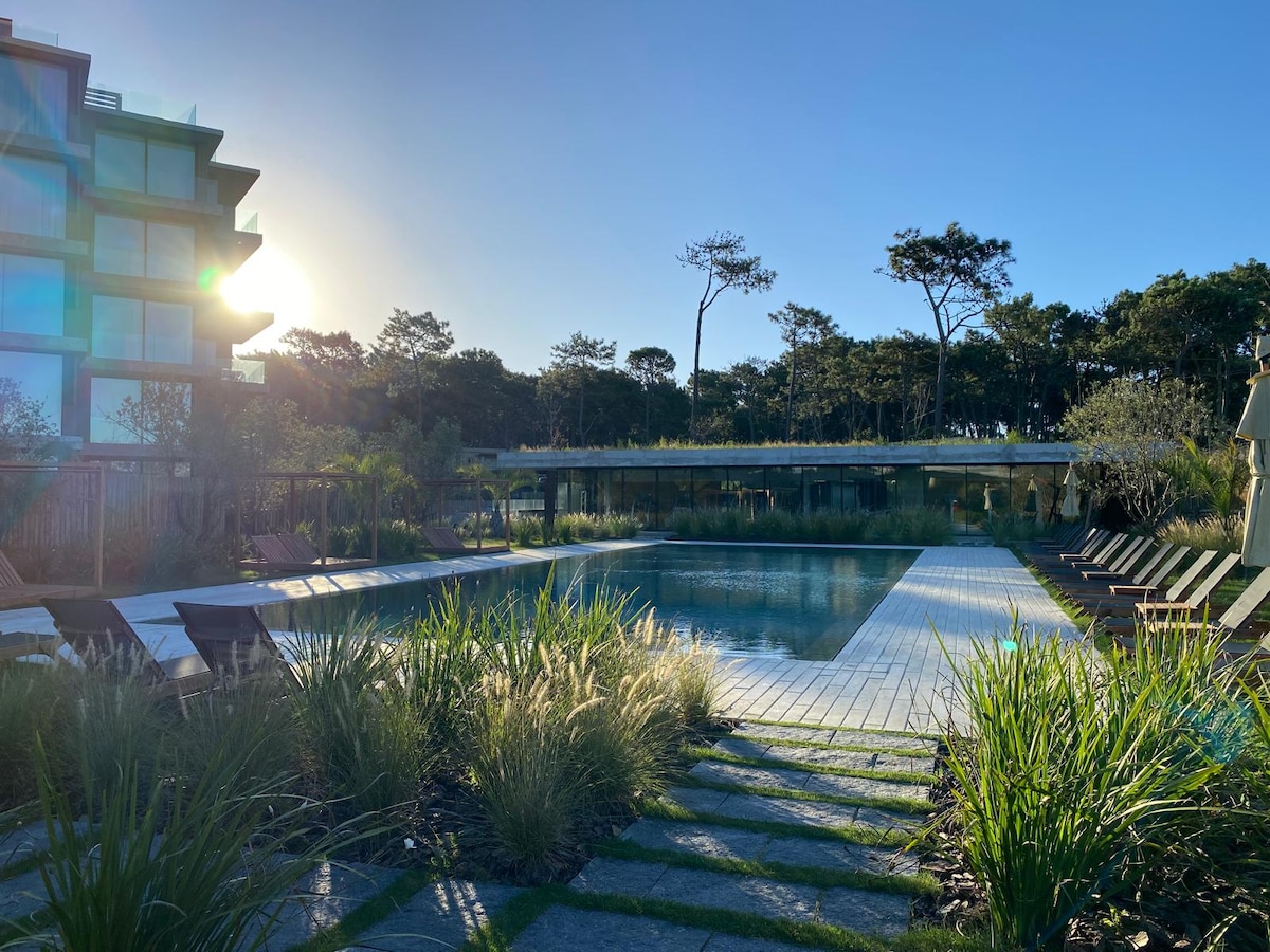 Departamento en el nuevo complejo Palcos de la Posta, ubicado sobre la playa La posta del cangrejo con vista al mar, en la barra, con pileta, gimnasio y parrilla. Servicio de limpieza diario y en temporada de verano servicio de playa.