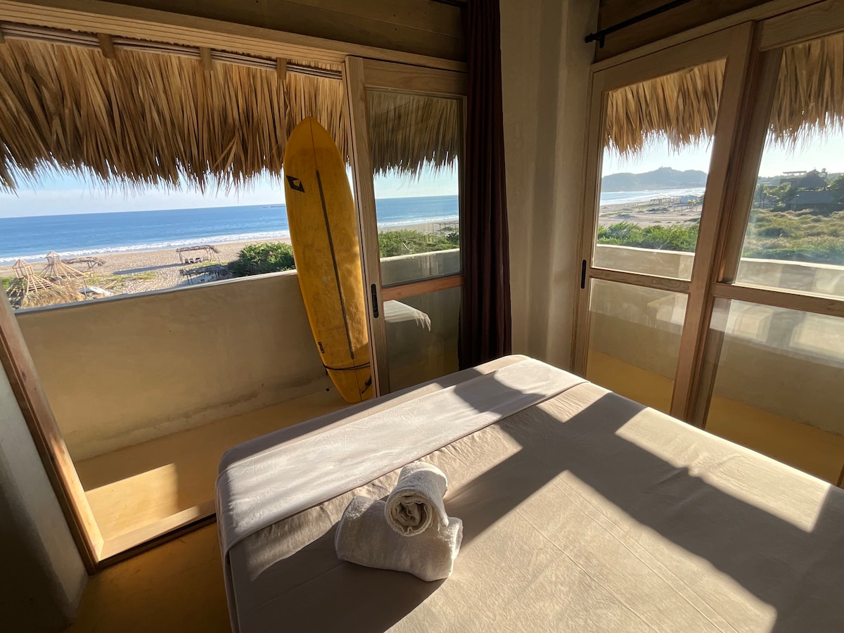 Habitación con impresionante vista al mar desde tu cama tamaño Queen-size, con sistema nuevo de aire acondicionado y un ventilador de techo. Además de que la puerta dividida en 3 cejas, cuenta con mosquitero puedes abrirla para disfrutar mejor el paisaje y cuando lo desees, cerrarla para mayor privacidad. La habitación tiene baño propio. Puedes relajarte a la orilla de la playa en los camastros o hamacas o simplemente en tu terraza tomando un rico café.