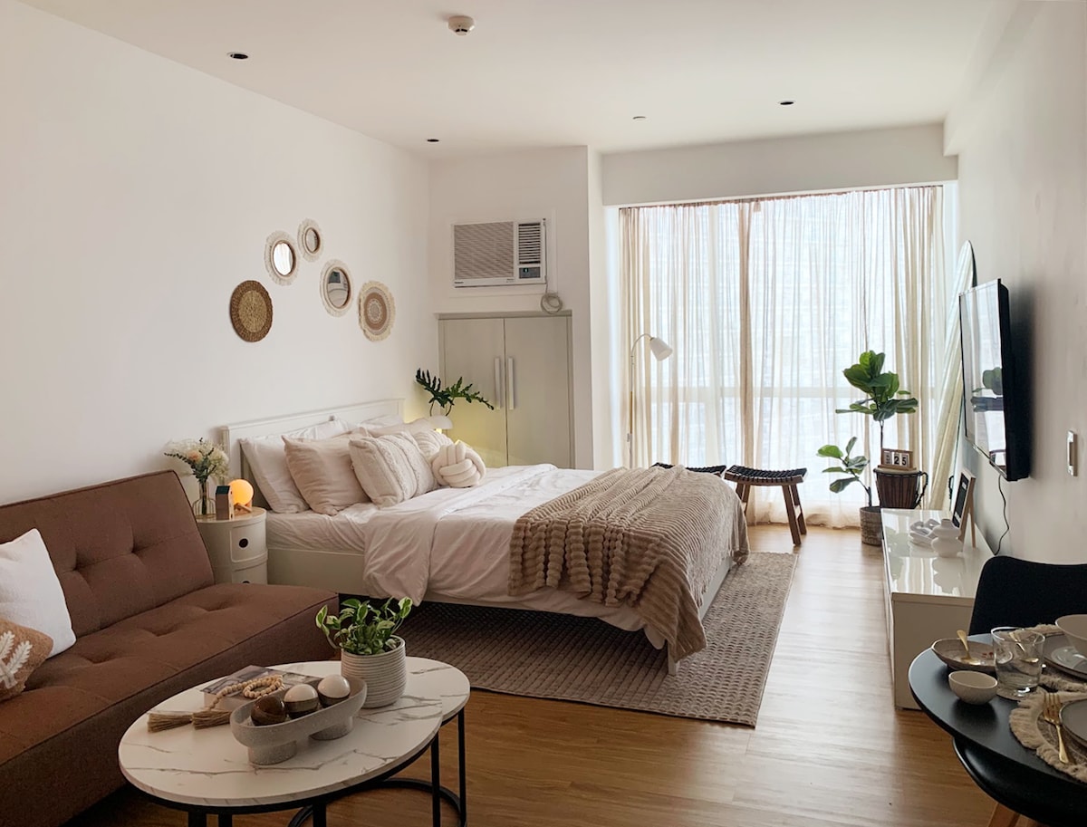 Stay in the center of the action in this one-of-a-kind place. Near to everything that you need. A very nice place to stay, hangout or just chill. * Aircondition * 65-inch TV * Soundbar Speakers w/ Subwoofer * WiFi * Air Purifier * Bed Size Double 54x75 * Pull-out Bed size twin KITCHEN * LG Refrigerator 7cuft. * Induction Cooker * Microwave Oven * Electric Kettle Pots & Pans * Kitchenwares & Utensils * Dinnerware BATHROOM * Single Point Water Heater * Fully Automatic Washing Machine
