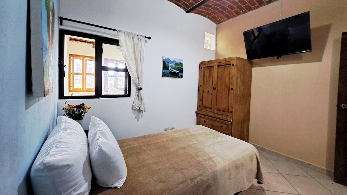 Cuarto sencillo y cómodo en casa boutique | Ajijic Este cuarto individual es una opción práctica y accesible dentro de nuestra casa boutique en Ajijic. Diseñado para quienes buscan un espacio tranquilo para descansar, ofrece lo esencial. Ideal para viajeros que pasan la mayor parte del tiempo fuera y solo necesitan un lugar seguro, cómodo y bien ubicado para dormir. Una opción funcional dentro de un entorno tranquilo y con buen gusto. Es el único cuarto de casa Axixic sin aire acondicionado.