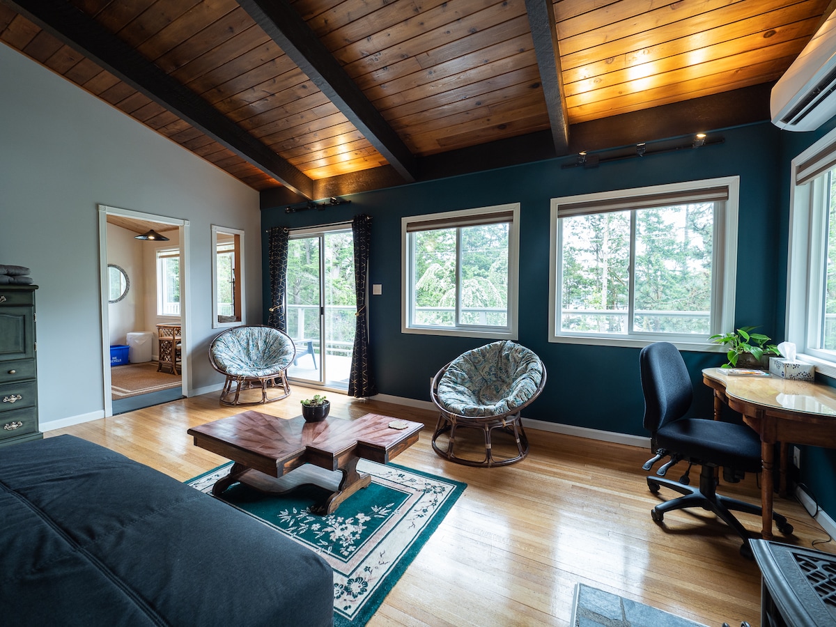 Esta casa de campo limpia y acogedora con un toque escandinavo se encuentra a 7 minutos a pie de la mejor playa para nadar y ver el atardecer en Salt Spring. Equipado con cocina, baño y cama tamaño queen, este es el lugar perfecto para disfrutar de un sabor de la vida de Salt Spring. Compra en un puesto de granja local y usa la cocina para cocinar una comida de la granja a la mesa. Luego, da un paseo por la playa para disfrutar de la mejor puesta de sol en Salt Spring. Después de un rápido paseo a casa, te espera una cómoda cama, o quédate despierto y juega a uno de los muchos juegos de mesa que se ofrecen.