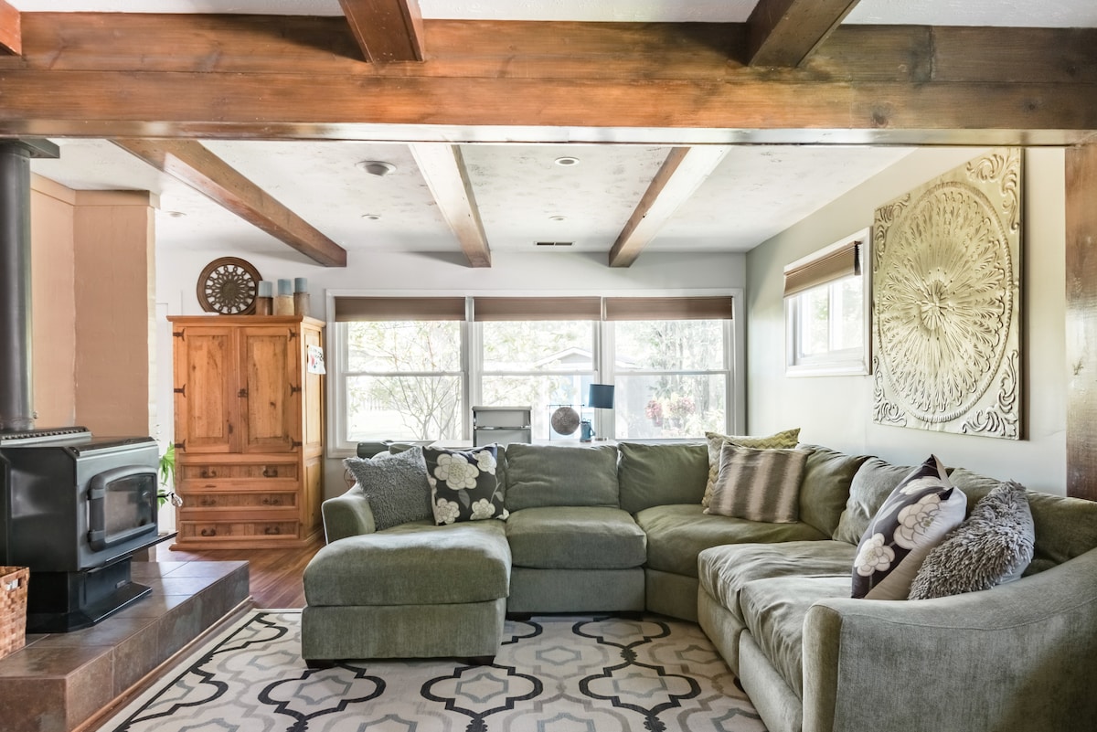 Adéntrate y disfruta del estilo de diseño interior de este alojamiento. Esta residencia cuenta con suelos de madera oscura y vigas de madera arquitectónicas, una mezcla de estética rústica y elegante. Tiene una planta abierta con dos grandes salas de estar centradas alrededor de la cocina con barra de desayuno. El espacio al aire libre cuenta con una parrilla para barbacoa y un lugar para hacer fogatas con muchos asientos y comedor al aire libre. Para los niños hay un columpio y un arenero. Muy familiar. Para dormir, hay tres dormitorios grandes. Los grupos de más de seis personas tienen a su disposición 2 colchones de aire individuales y uno tamaño queen, así como 2 sofás modulares grandes. Mi casa está completamente actualizada con todos los servicios de un hotel de alta gama. Hay internet de alta velocidad, una parrilla de propano, un lugar para hacer fogatas y un hermoso patio con una mesa y sillas para disfrutar del pintoresco patio trasero. Todos los dormitorios tienen televisores de pantalla plana y la sala familiar está equipada con un televisor de alta definición de 70 pulgadas. Somos muy amigables con las familias y podemos proporcionar una cuna, corralito, silla alta o juguetes para tus pequeños. El enorme patio trasero también tiene un columpio, una casa de juegos y un arenero. Realmente es un hogar lejos de casa. Los huéspedes tendrán acceso completo al alojamiento, a excepción de un armario del propietario y una cómoda. Estoy muy cerca. Podemos interactuar tanto o tan poco como quieras. La propiedad se encuentra en un barrio tranquilo y acogedor. Se encuentra a 10 minutos de todas las autopistas principales, a 5 minutos del aeropuerto, a 15 minutos del centro de la ciudad y a solo 20 minutos de la Clínica Cleveland. Berea cuenta con dos lagos. Coe Lake ofrece un enorme parque infantil recientemente ampliado, un anfiteatro, senderos para caminar, una piscina comunitaria y un pabellón con parrillas. Justo al final de la carretera, Wallace Lake tiene una zona de playa y una cascada con senderos para bicicletas. También hay restaurantes locales impresionantes. Esta ubicación se encuentra a menos de 1 milla de una parada de autobús y a 5 minutos del sistema de trenes. Mi casa tiene tres dormitorios con tres camas tamaño queen con capacidad para seis personas. También hay dos sofás modulares con capacidad para tres personas más. También hay colchones de aire disponibles.