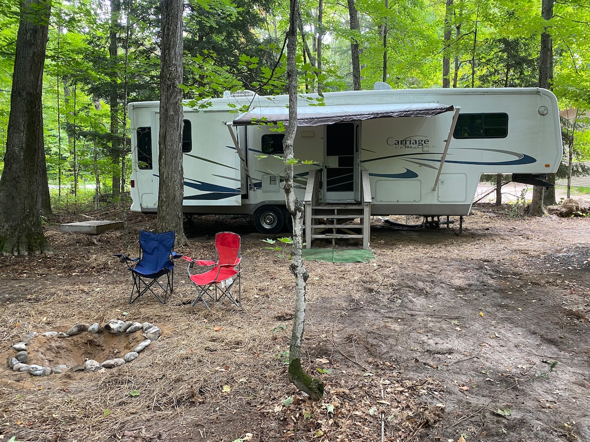 The Betsie Camper: caravana de quinta rueda de 35 pies en excelente estado en nuestro bosque trasero. Capacidad para 6 personas: cama tamaño queen, sofá cama y colchones inflables tamaño queen. Poseemos 20 acres de bosque con varios senderos a través del bosque. Tiene agua, electricidad, aire acondicionado, nevera, fogones y cocina, ducha y otras necesidades básicas. La caravana está a varios metros de la casa, por lo que tendrás tu propia privacidad. Hay un jacuzzi al aire libre y un pozo de fuego que está disponible para su uso.
