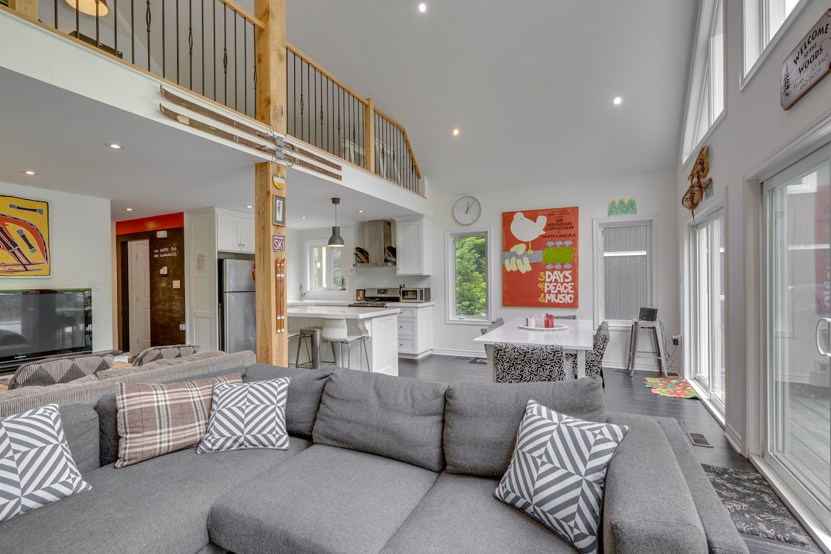 Moderno chalet de 4 camas y 2 baños con Internet de alta velocidad BELL FIBE y nuevo JACUZZI de 49 chorros para 6 personas, a solo 5 minutos de la colina de esquí de Mt St Louis. La cocina/comedor/sala de estar de concepto abierto fluye hacia una enorme terraza con vistas al bosque. Ideal para parejas, aventureros, familias y grupos. Disfruta de senderos privados, esquí, raquetas de nieve, ciclismo/senderismo, mesa de billar y mucho más. Se admiten perros bien educados. Para actividades locales, busca "The Chalet Moonstone" en YouTube.