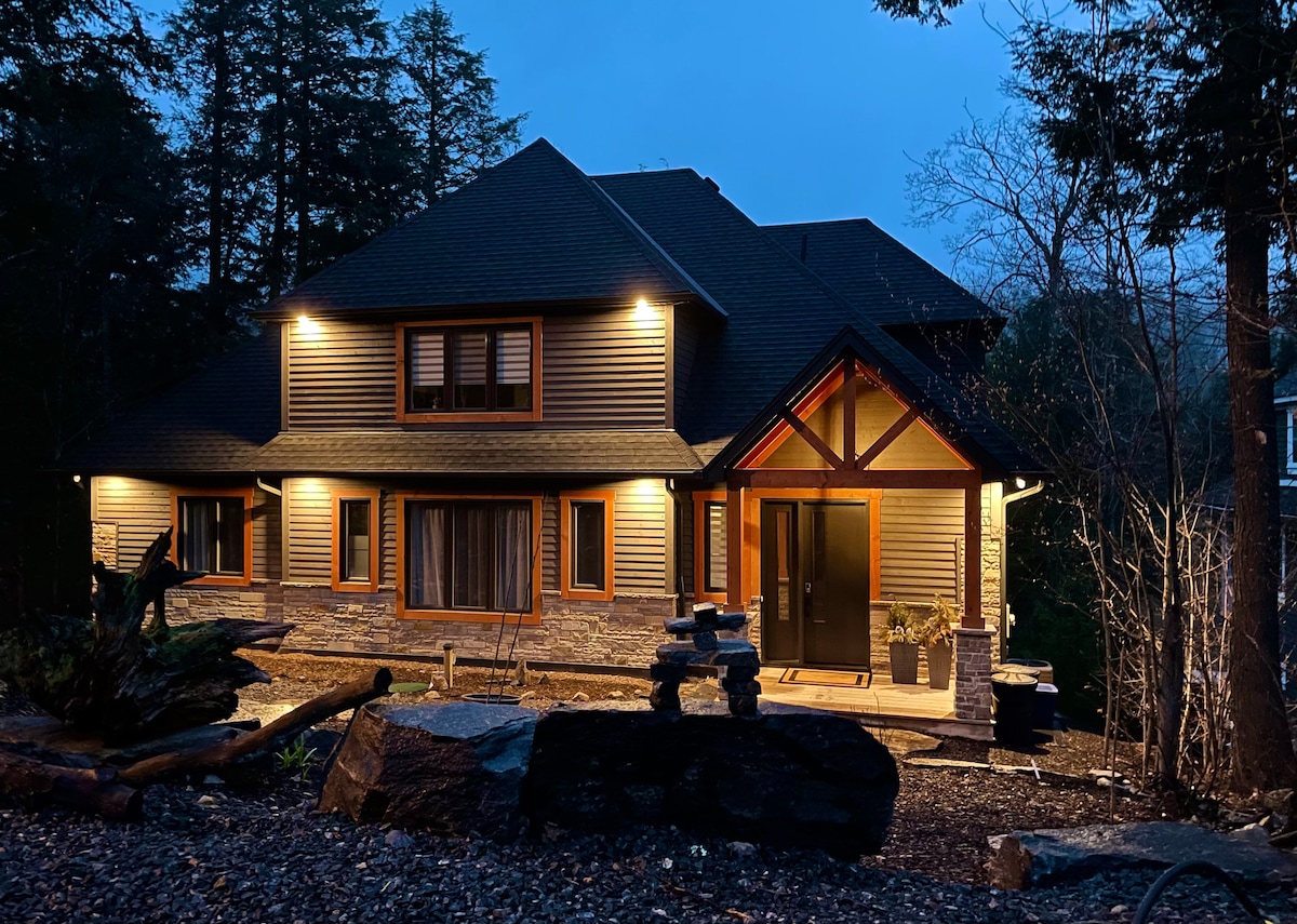 Impresionante refugio para familias y parejas maduras. Frente al campo de golf Deerhurst, a solo 2 km de la zona de esquí y snowboard Hidden Valley. Rodeado de senderos para ciclismo/caminata/raquetas de nieve, pistas de esquí, campos de golf, Arrowhead y Algonquin Parks, para todas las actividades durante todo el año. Comodidades de diseño de primera línea, bañera de hidromasaje holística de 63 chorros para 9 personas, cine con pantalla de proyección de 135 pulgadas, área de arena privada frente al estanque del campo de golf (sin acceso al agua). ¡Llueva o haga sol, la escapada perfecta!Máximo 8 adultos y niños