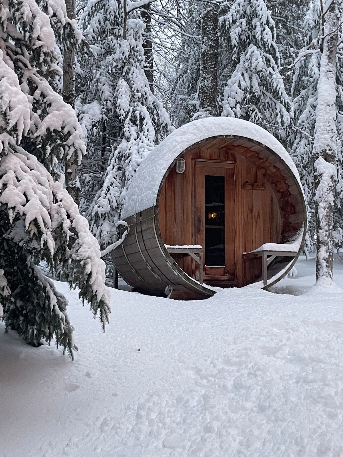 La cabaña ofrece un espacio sereno para compartir con amigos y familiares rodeados de naturaleza. Disfruta de estanques de castores a lo largo de los senderos, juegos de interior/exterior, estufa de leña, sauna, jacuzzi, chimenea, wifi, bañera de hidromasaje, televisores inteligentes de 75" y 55" y servicios de streaming. Cocina totalmente equipada, horno doble, encimera de granito. En invierno, raquetas de nieve y trineos. En Navidad, la casa está decorada y cuenta con un árbol de 15 pies. A 20-25 minutos de Mount St. Louis y varias playas.