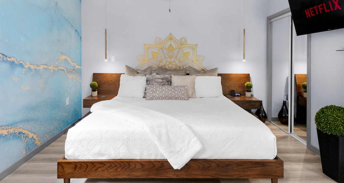 ¡Te damos la bienvenida al lujo, la luz y la vida espaciosa! Este espacio recién redecorado se creó pensando en tu comodidad. Hermosos muebles, obras de arte, colchón king de calidad superior y sábanas te permitirán relajarte y rejuvenecer por completo. Disfruta de comidas en la gran cocina bien equipada con comedor en el interior o en el patio privado. ¡Con la lavadora y la secadora, tienes todo lo que necesitas para que tu estancia sea fácil, conveniente y lujosa! Amplio estacionamiento gratuito "solo para huéspedes" y carga Tesla de 44 millas por hora.