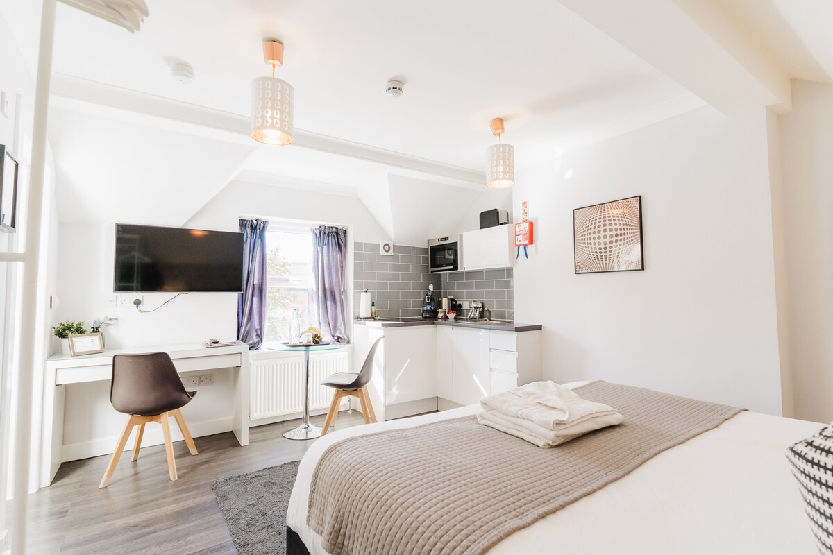 ¡Bienvenido a nuestro encantador estudio en el primer piso en Sweet Suites Lytham! Este acogedor espacio ofrece una cómoda estancia con una cama superking y un moderno baño con una cómoda ducha a ras de suelo. La cocina pequeña bien equipada permite una fácil preparación de comidas. Disfruta de las pintorescas vistas de la ciudad desde tu ventana y aprovecha nuestra ubicación central. Mantente conectado con wifi gratuito y disfruta de la comodidad del estacionamiento de cortesía. Perfecto para negocios o por placer.