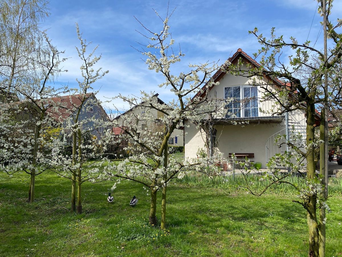 Da wir es selbst lieben zu verreisen und viel unterwegs sind, haben wir uns entschlossen, einen Teil unseres kernsanierten Hauses zu vermieten. Die Wohnung verzaubert mit einem großen Balkon (23qm), von dem man nicht selten die Berge sieht. Der Weg an den schönen Bodensee lässt sich mit einem wunderbaren Spaziergang durch die Obstplantagen verbinden. In vier Minuten (zu Fuß) ist man im Edeka, ebenso ist der Lidl gleich um die Ecke.