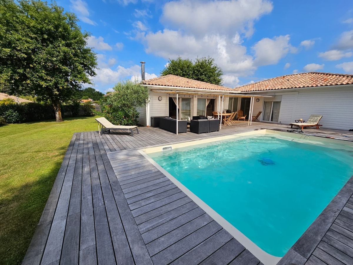 En el borde del bosque, ESPLÉNDIDA casa nueva con aire acondicionado y una piscina climatizada por paneles solares, decorada con gusto y amor. Se sentirá como en casa con la dulzura de estar de vacaciones en un lugar muy agradable, CÓMODO y moderno. Todo está previsto para que no te falte de nada. En pocos minutos en bicicleta, coche o a pie, se puede disfrutar de la cuenca de Arcachon y sus hermosas playas. No lo dude más, reserve su estancia tranquila para complacerlo.