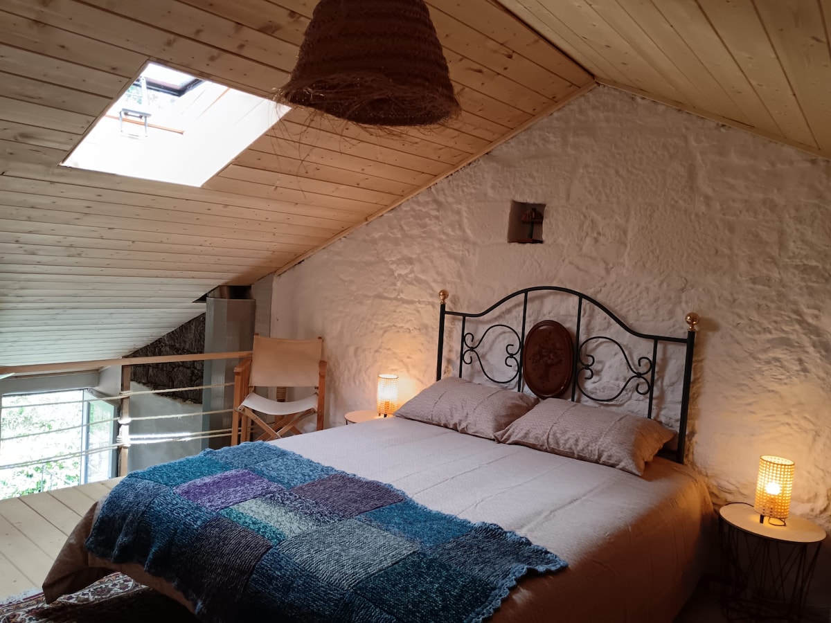 Casa de piedra con piscina y jacuzzi privados, recientemente restaurada, de 140 m2 distribuidos en dos plantas. En la planta baja está el distribuidor que nos conduce a un espacio amplio y diáfano, donde se encuentra: el salón con chimenea, smart TV, sofá chaise longue, el comedor y la cocina. En la planta alta están las dos habitaciones con sus baños. Desde esta planta se accede a la terraza y al amplio jardín donde se encuentra la piscina y el jacuzzi privados.