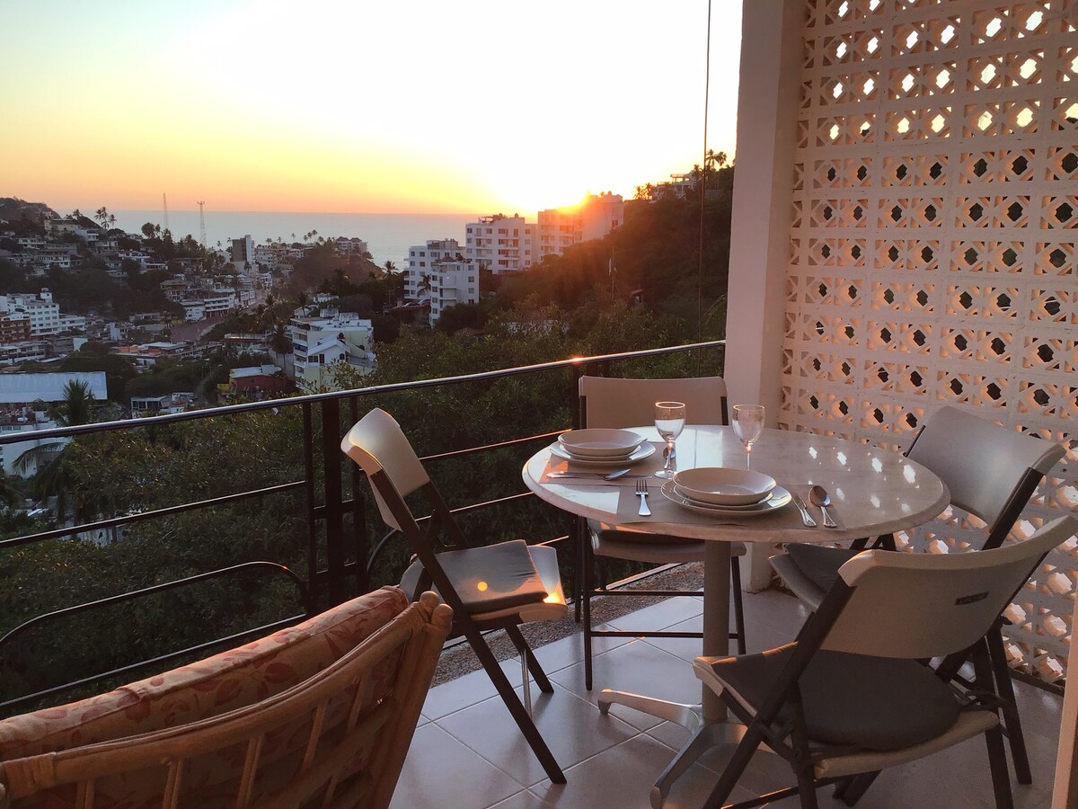 Disfrute su cena con vista al mar y puesta de sol impresionante. Condominio de planta baja en conjunto tranquilo cerca de costera y la Quebrada. La alberca es espectacular con vistas de la bahía y Roqueta. A veces se pueden ver ballenas de noviembre a febrero! La unidad tiene buena brisa. NO HAY AIRE ACONDICIONADO. Hay ventiladores de techo en la sala/comedor/recámaras. Estacionamiento y seguridad las 24 hrs. Para acceso se requiere nombre/ID con foto de un huésped + placas de coche.