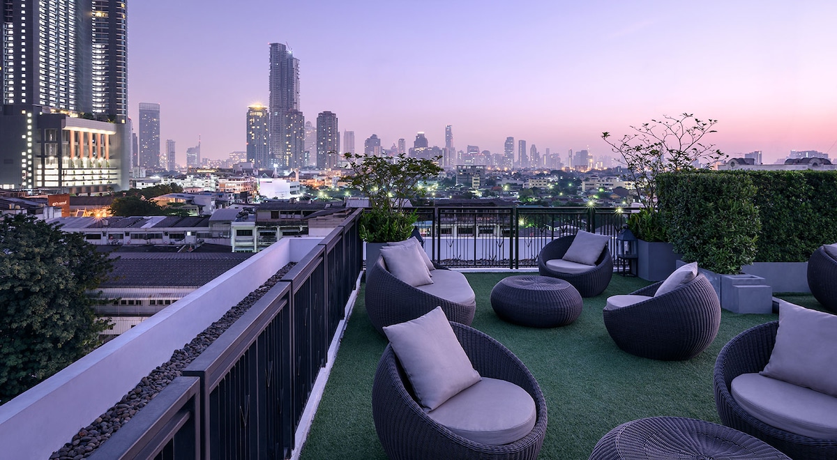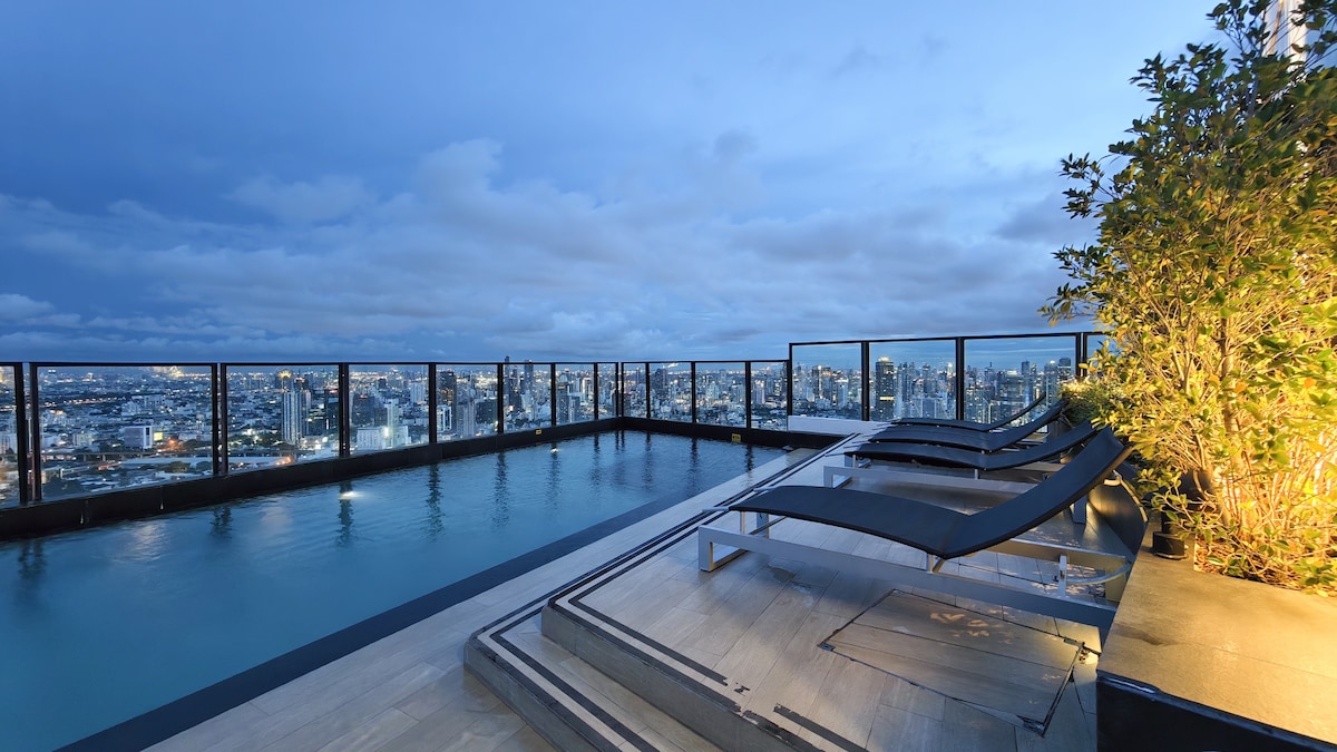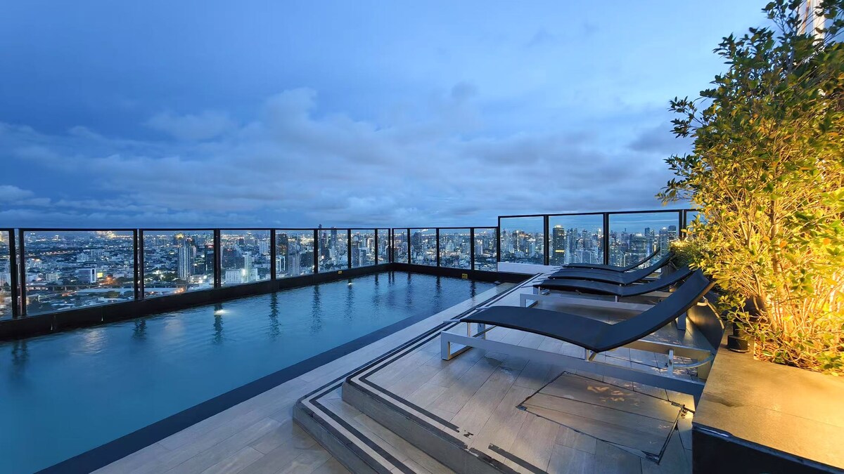 Estudio B1D en el centro de la ciudad/cerca del metro/vistas de la ciudad desde lo alto/área comercial de Siam/recogida gratuita/piscina al aire libre/gimnasio/bar en la azotea/recogida y traslado al aeropuerto durante cuatro noches