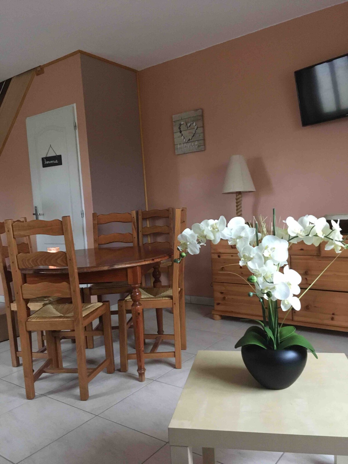 Alojamiento cálido, 44 m², planta baja orientada al sur, terraza soleada y sombreada. Perfectamente situado en el corazón de la ciudad. Acceso a todos los sitios y comodidades. A pocos minutos a pie de la estación de tren. Estacionamientos en frente y en las inmediaciones: gratis 1 hora o total después de las 18:00 y el domingo, permanente a 200 m. - Cama de 160 X 200 - Ducha 120x80 - TV de 50' - Cocina equipada: placa eléctrica, campana extractora, horno, microondas, frigorífico-congelador, hervidor de agua, cafetera DolcéGusto,lavadora - Wifi y RJ45.