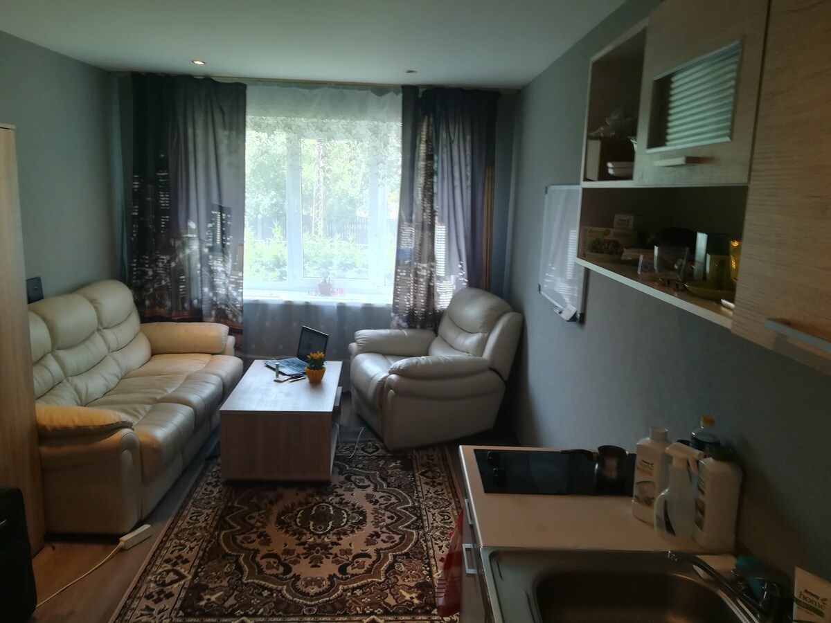 Una espaciosa casa de huéspedes tipo estudio con balcón y sauna ubicada en un barrio tranquilo de casas privadas para 2 adultos (+ un niño/adolescente). Un espacio abierto tipo estudio en la planta superior; aseo, ducha y sauna en la planta baja. Tiene grandes ventanales y un balcón frente a los árboles y un patio. Cocina, nevera, chimenea, wifi, aparcamiento gratuito y lavadora. A 1200 metros del centro de la ciudad y de cafeterías y a 700 metros de senderos para caminar a lo largo del río. Comunicación en letón e inglés fluido. Puede haber un perro y un gato en el patio.