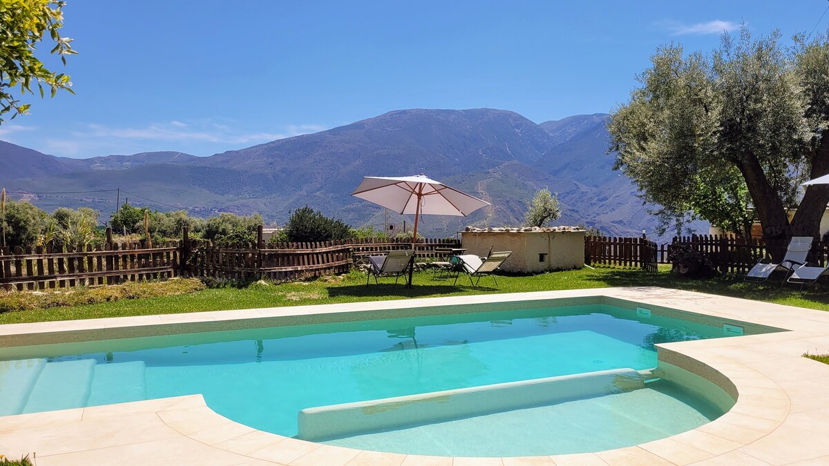 Casa con piscina en una parcela de 7.000 m2 completamente vallada, con olivos, viñas y frutales y unas magníficas vistas a Sierra Nevada y Sierra de Gádor. Construcción reciente y de calidad. Casa completamente equipada. Tiene chimenea, y la leña está incluida en el precio. Piscina con depuradora e iluminación. Piscina fuera de uso desde el 15 de octubre hasta el 15 de mayo. Espacio muy amplio para aparcar dentro de la finca. Completamente privado, uso exclusivo de la casa, piscina y jardín.