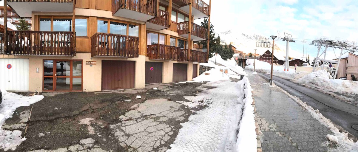 A los pies de las pistas, Salida y regreso Ski a los pies. En la pequeña residencia del Chat Perché Armario de esquí en la Planta baja Apartamento estudio: Entrada con zona de montaña litera para dos niños. Cuarto de baño con bañera, inodoro separado. Habitación principal que incluye zona de cocina , sala de estar, sala de estar cama altillo 140 y sofá cama 140, orientación sur con acceso al balcón, tendrá vistas a las pistas, al complejo y a la montaña. Apartamento ideal para una familia.
