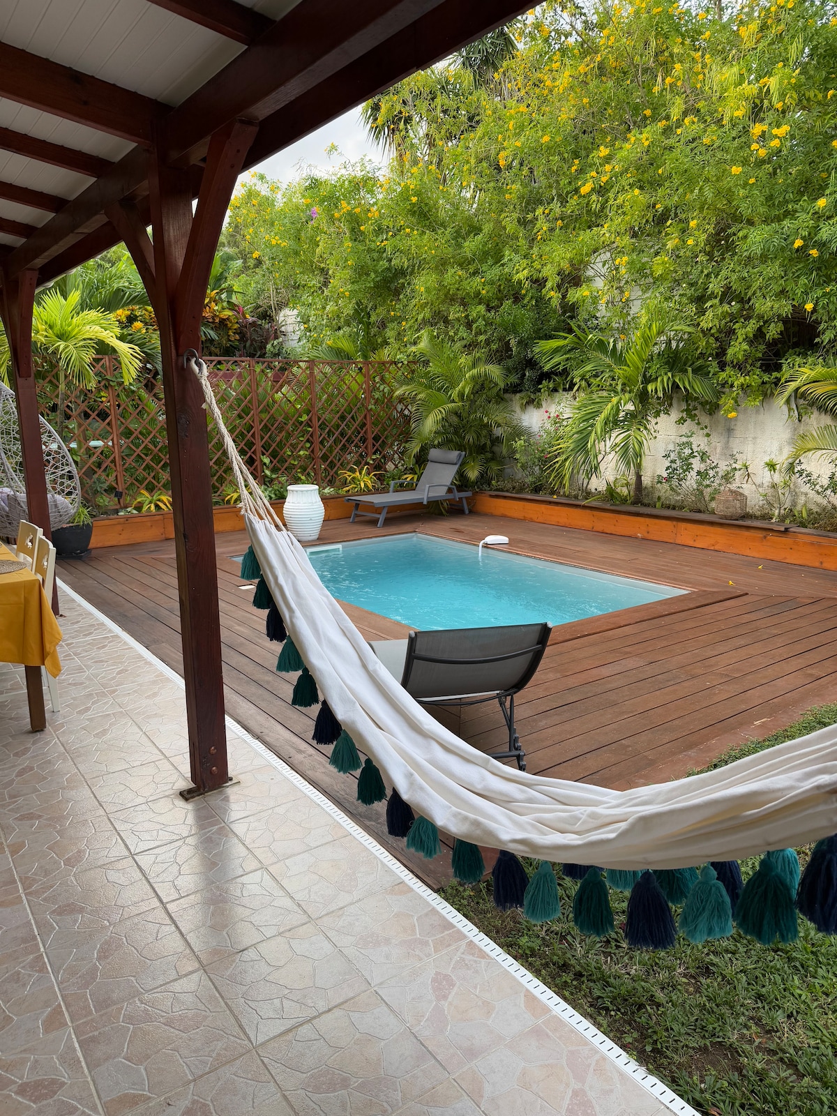 Situado a la entrada del pueblo de Trois-Ilets, municipio turístico por excelencia, Sapotille es un bungaló de madera nuevo de alto standing, con terraza y piscina climatizada privada. Comercios y transporte marítimo a poca distancia. Barrio tranquilo y ventilado.