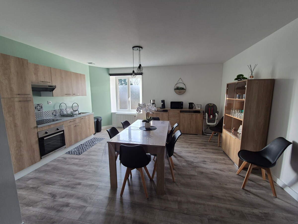 Esta casa, situada en una granja, incluye: - una cocina equipada (horno, nevera, placa de cocción, cafetera Senseo, tostadora, hervidor de agua, microondas), - 2 baños (con ducha), - 2 baños, - un salón/ sala de estar, - 3 dormitorios con 3 camas de 140, 2 de las cuales están equipadas con una cama supletoria de 1 plaza. Cuna y trona disponibles a petición. Se proporcionan sábanas, toallas y ropa de cama para su estadía.