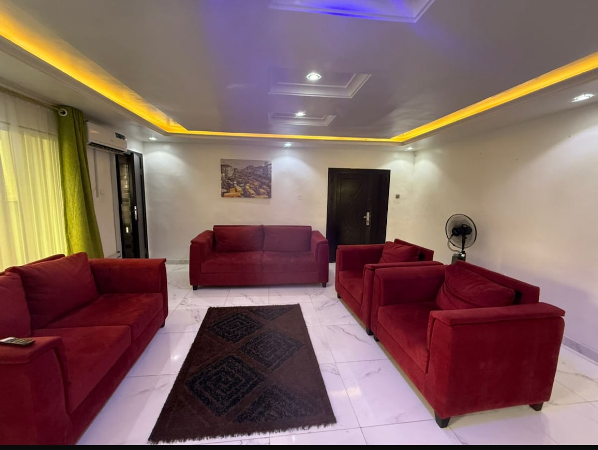 You're welcome to our apartment, located in a gated estate with restricted access to the general public. We offer 24rs electricity and air conditioning of your apartment. It is a tasty, Homely & Family-themed 2-Bedroom Apartment with a Balcony. It's the perfect place for a family vacation & weekend getaway, bridal showers, marriage proposal etc. We have the following: 24hrs Electricity 24hrs Air Conditioning 24hrs hot water Clean Water Starlink Wi-Fi Errand services
