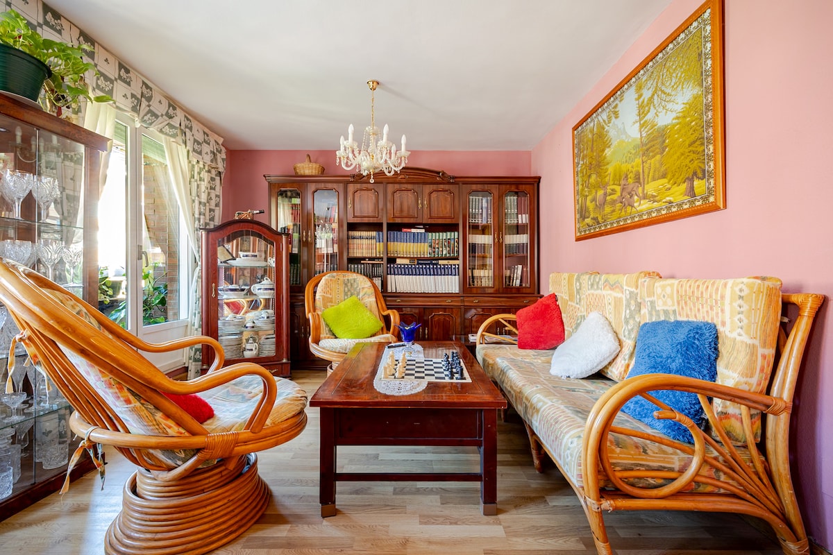Encantador chalet de dos plantas con jardín exterior espacioso, tranquilo y muy cuidado. Porche amplio, amueblado, con vistas a la piscina y solarium. Cuatro habitaciones: una con cama matrimonio y baño incorporado, otra con litera de dos camas y otras dos con dos camas individuales cada una. Tres baños completos (2 con ducha y 1 con bañera). Salón/comedor con chimenea y tv. Cocina completa con menaje, horno, micro, vitro y nevera. Lavadora y secadora. Garage 2 pzs. Calfcción gasoil