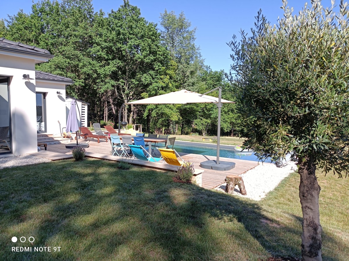 Venga a alojarse en un entorno verde y tranquilo. Cerca de Bergerac y del aeropuerto (20 minutos) A 5 minutos de la A89, Burdeos (1 hora). Villa nueva clasificada con 3 estrellas, orientada al sur, terraza de 65 m² con piscina y ducha exterior. Terreno de 5000 m2 tranquilo para unas vacaciones exitosas. Zona de descanso barbacoa cancha de petanca En el interior Cocina abierta totalmente equipada, sala de estar, comedor y dormitorios abiertos a la naturaleza. Suite principal, otros dos dormitorios con baño.