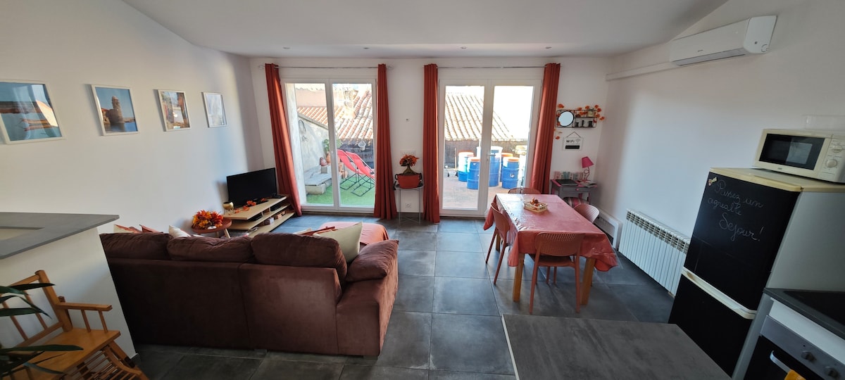 En un pueblo en el sur de Francia, bonita casa independiente de 80 m2 con terraza de 75 m2 sin frente con vistas panorámicas del Canigó dando al turismo mar con un entorno rico . Ruta de los Vinos senderismo , lago ... En asociación con el Hotel Cave -Restaurant Riberach la oportunidad de beneficiarse de reserva de servicios adicionales ( desayuno y Spa, y Spa almuerzo, té y acceso al spa con sauna, baño turco , jardines y piscina ) .