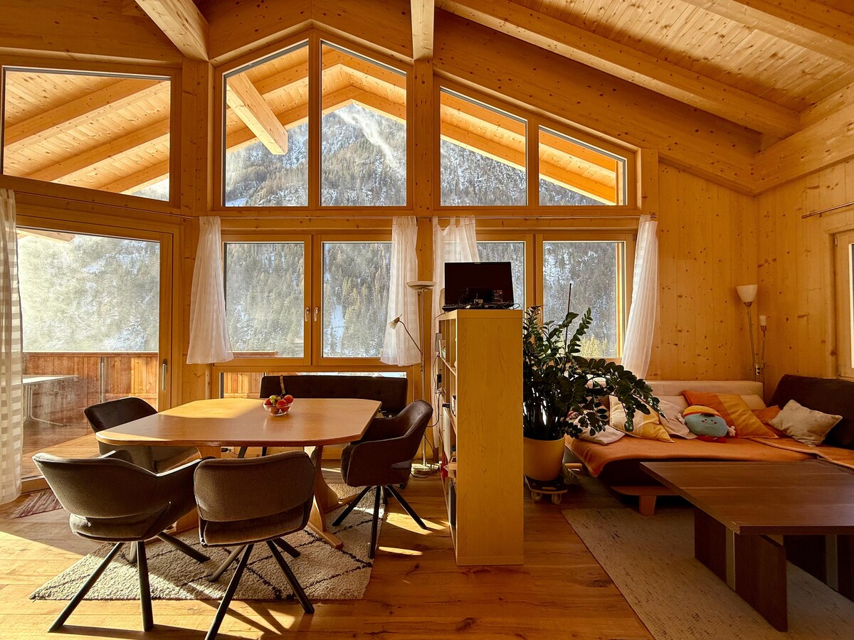 ¡Chalet panorámico exclusivo en medio de las montañas más altas! Relájate en este alojamiento tan especial y apartado. Desconecta y recarga las pilas en un entorno de montaña que te dejará sin palabras. Disfruta de agradables veladas frente a la chimenea o relájate en la sauna. Desde el jacuzzi podrás disfrutar de las vistas a las montañas que lo rodean. La maravillosa terraza panorámica y el gran ventanal frontal permiten disfrutar de unas vistas únicas.