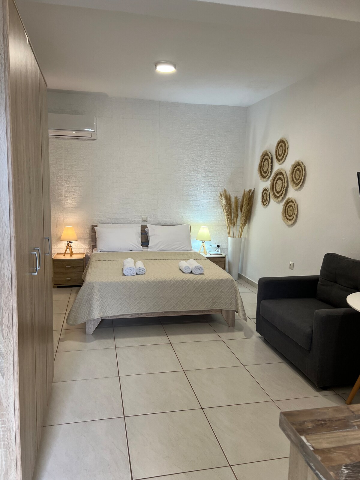 La casa de ARETE está aquí para ayudarte a relajarte y disfrutar de las vacaciones de verano. Totalmente remodelada, nuestra casa ofrece todas las comodidades modernas, ubicada entre olivos, está a solo cien metros de las playas de arena de Skala Kalirahis y el puerto deportivo. Todas las tiendas y cafeterías están aún más cerca. Si buscas una sensación de tranquilidad o incluso aislamiento, puedes usar el salón de pérgola rodeado de olivos. Su ubicación combina idealmente diversión, relajación, tranquilidad para tu familia o amigos.
