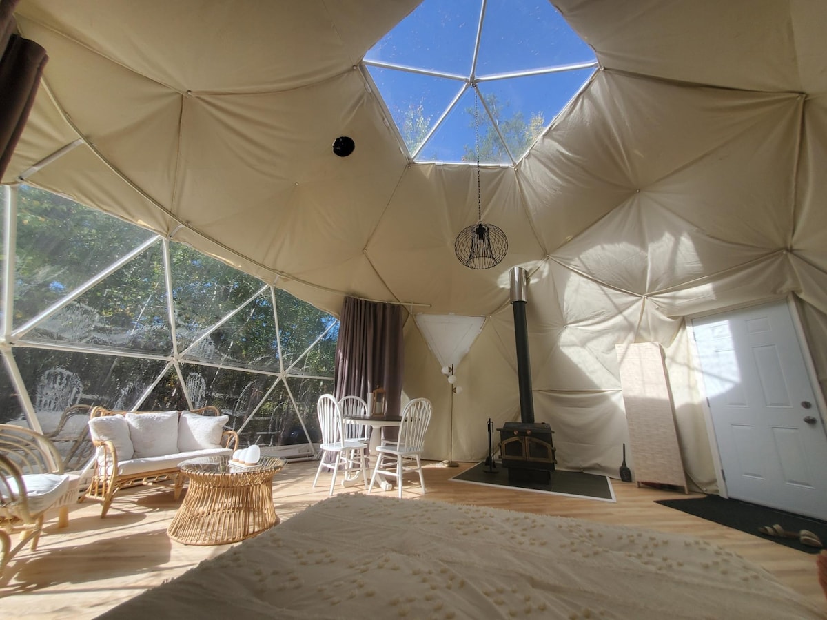 This off-grid 4 season glamping dome cabin is located on a beautiful 20 acre property at a 10 min drive from the shores of Lake Winnipeg and 5 mins away from Gull Lake. Enjoy walking on our forest trails, have a soak in our wood-fired hot tub, take our inflatable boat out for a paddle, or go explore the countless hiking trails nearby. Located just off a groomed snowmobile trail, this is a perfect home base for snowmobilers, ice fishermen and cross-country skiers in the winter time.
