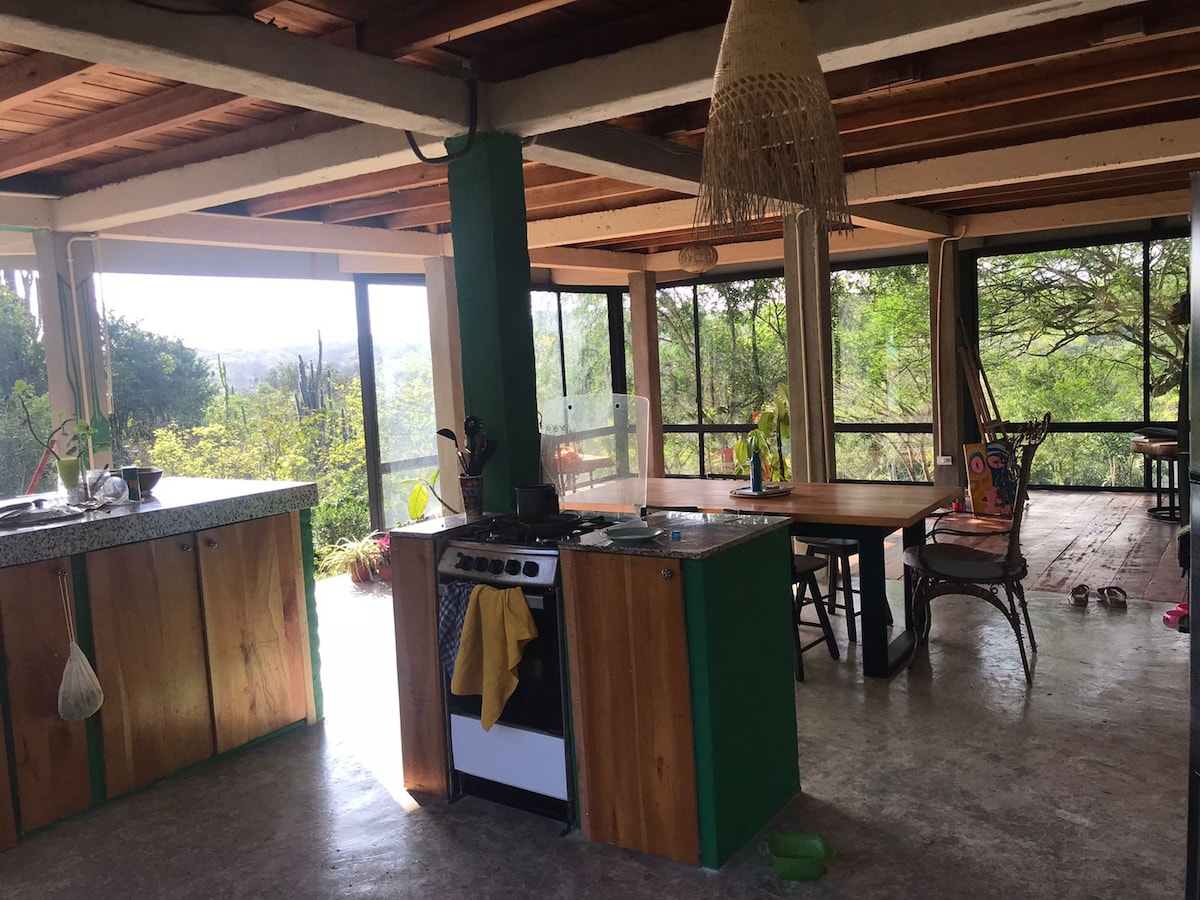 Enclavada en una montana en medio de la naturaleza, ubicada estratégicamente para ver el mar desde cualquier lugar de la casa. El canto de los pajaros, el vaivén de las olas, maravillosos amaneceres y atardeceres junto con los sonidos de la naturaleza acompañarán tu estadia y podras gozar de días de pleno descanso. La casa esta ubicada en la Comuna Cadeate a 5 km de Montanita y en las fincas del sector puedes conseguir productos orgánicos a precios muy convenientes