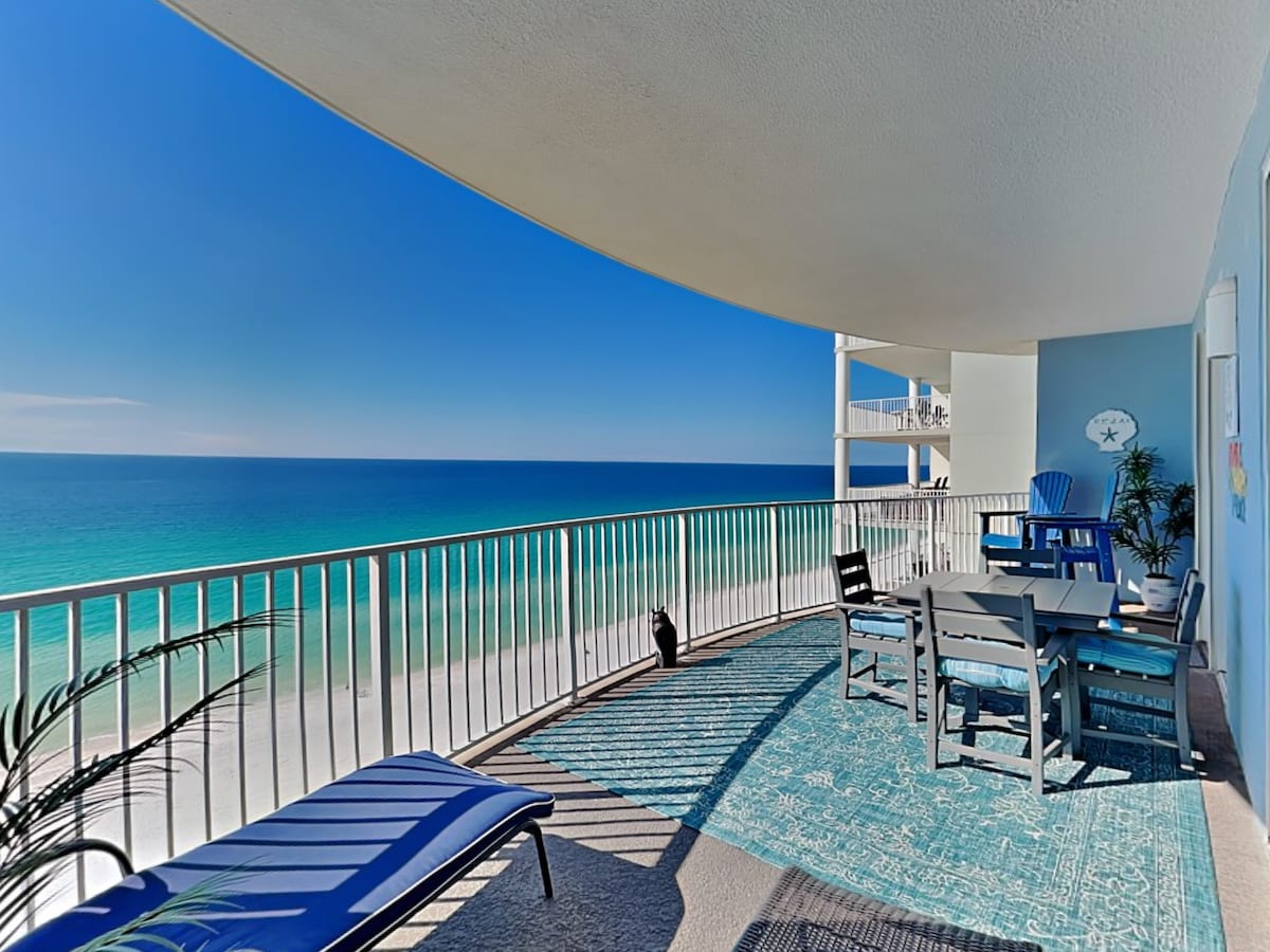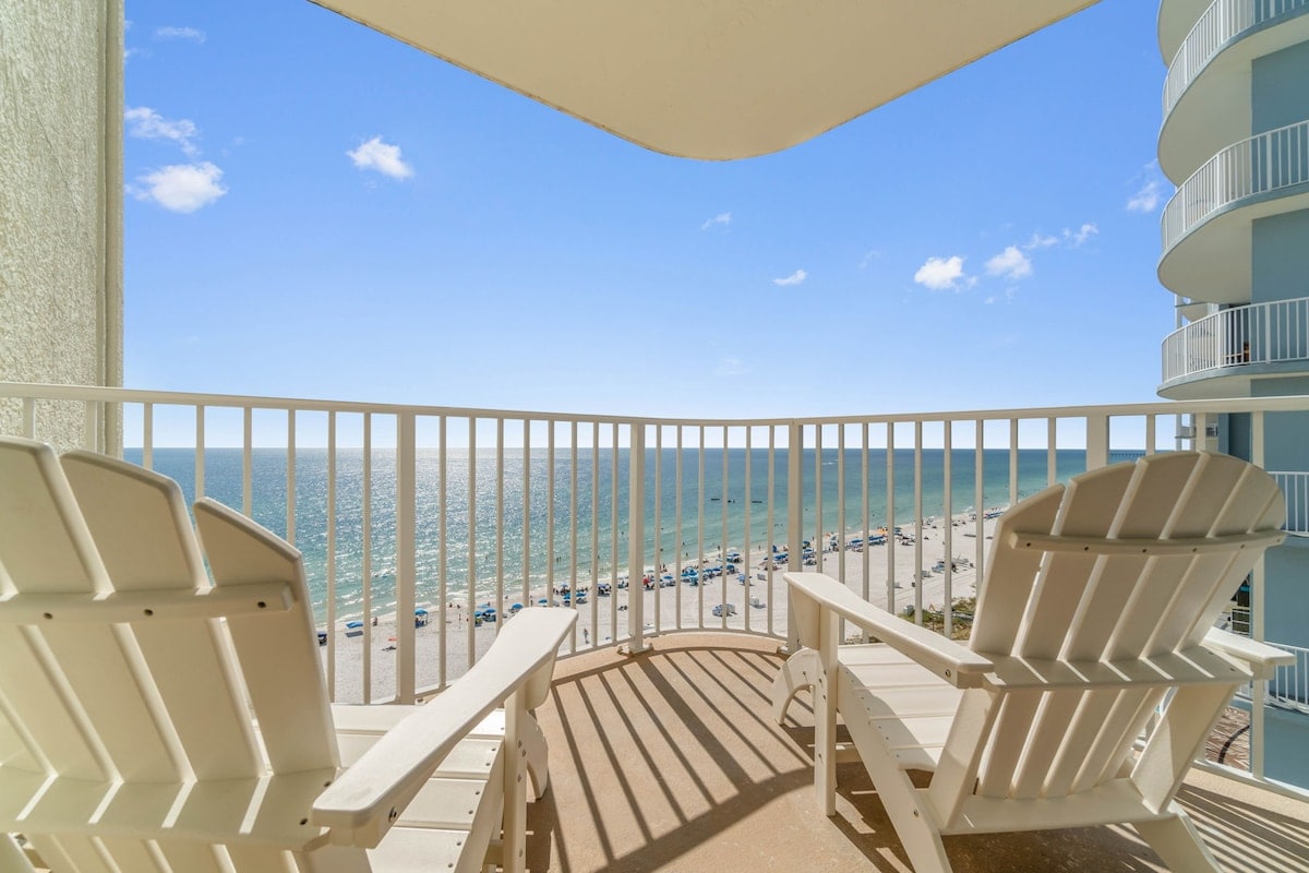 Condominio de lujo recién renovado frente a la playa en el piso 13 con 3 dormitorios/2 baños, techos altos, impresionantes vistas al mar, 2 camas tamaño king, 1 cama tamaño queen y dos camas individuales plegables, amplia sala de estar. Disfruta de una piscina climatizada, gimnasio y zona de picnic para asar. Camina hasta Pineapple Willy's y restaurantes cercanos; cerca de WonderWorks, Ripley's Believe it or Not, Shipwreck Island Water Park, Coconut Creek mini golf y el muelle público. Edificio tranquilo, 2 ascensores. A 5 millas de Pier Park, estacionamiento de pago al otro lado de la calle.