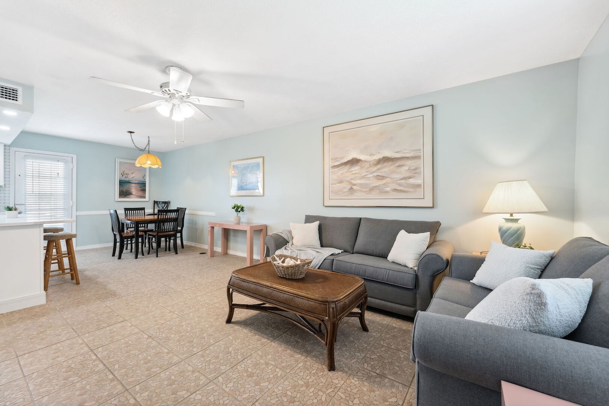 3 minute walk to the beach! Mostly newly renovated, 2 br 2.5 bath. Sleeps 6 Townhouse located in a gated community with 11 pools (5 heated) one pool located on the beach! shuffleboard, 4 tennis courts, gym, and 2 acres of mini golf. Golf cart rentals aval, We are centrally located to the areas main attractions and restaurants. Just a quick walk across the street from the beach. 2 numbered parking spaces right outside of the unit. Fully stocked kitchen with coffee/Keurig maker,Espresso machine.