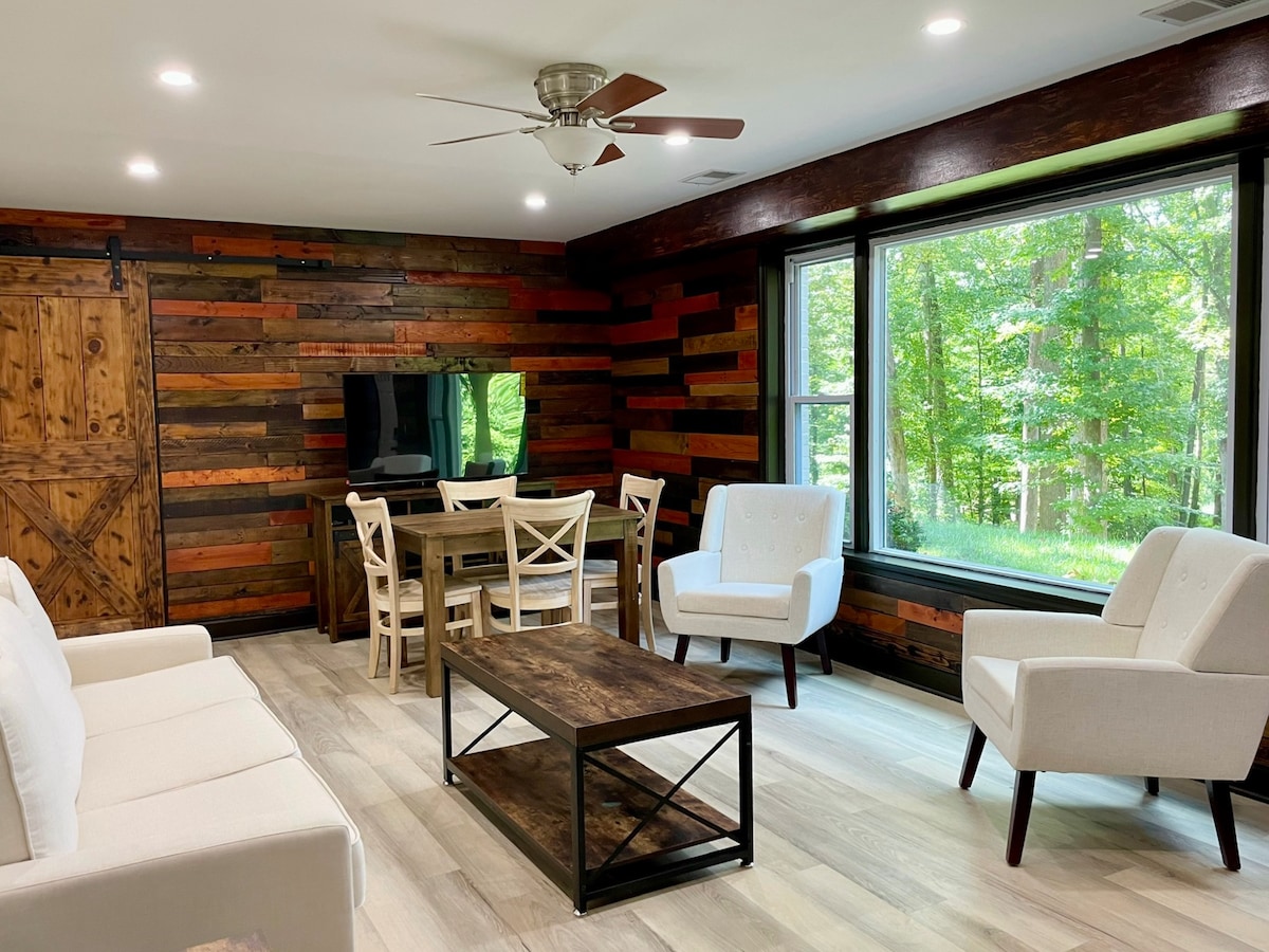 Tucked away in a peaceful, wooded setting near DC, this apartment with a private entrance features a bright, airy layout designed for comfort. Living/dining/kitchen with fireplace, 65” TV, books & games, fully stocked kitchen, and workout gear. King bedroom with famously comfy memory foam mattress, second bedroom with twin daybed + pop-up trundle, full bath with shower/tub combo, gigabit Wi-Fi, desks, porch + grill. 10 min to Metro, 20 min to DC, and 5 min to Greenspring Senior Living Community.