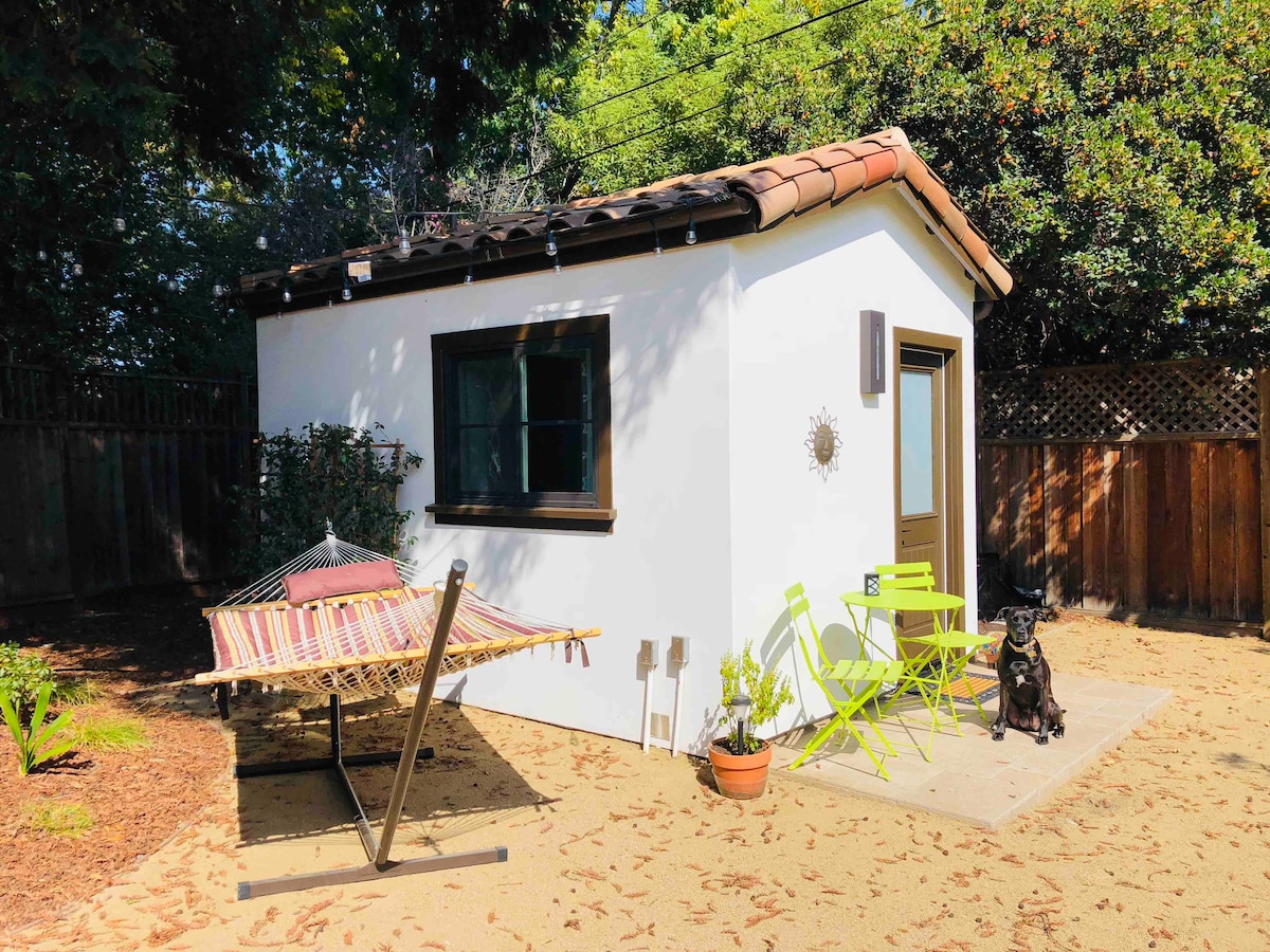 Recientemente pintada, nuestra tranquila, segura, muy limpia y pintoresca casa de huéspedes de estilo mediterráneo, se encuentra en un patio ajardinado debajo de un árbol de secuoya, y es adecuada para solo 1 huésped. Puedes ir cómodamente a pie a los cafés del barrio de Midtown, excelentes restaurantes y mercados. Accede rápidamente al campus de Stanford, a las empresas de Silicon Valley, a las áreas comerciales de San Antonio y a la estación de California Ave Caltrain en auto. Te invitamos a disfrutar de nuestro patio trasero, dormir la siesta en la hamaca o trabajar en el patio con acceso a WiFi.