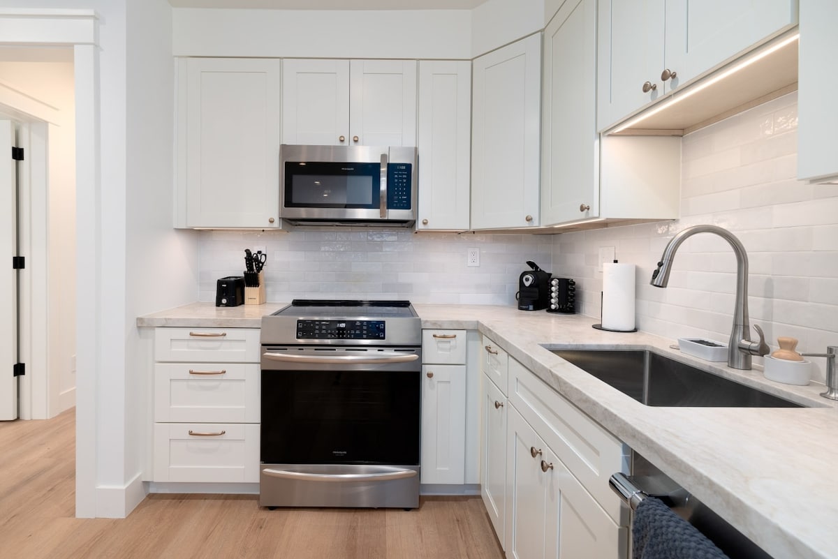 Suite 1b1b de nueva construcción, entrada privada, 500 pies cuadrados, a 10 minutos a pie del centro de la ciudad, que tiene muchas comodidades, como restaurantes, biblioteca, tiendas y estación de tren. Amplio y lleno de luz natural con ventanas. Cocina moderna con electrodomésticos de acero inoxidable que incluyen lavavajillas y estufa/horno. Calefacción y aire acondicionado disponibles. Disfruta de una experiencia elegante en este lugar céntrico.