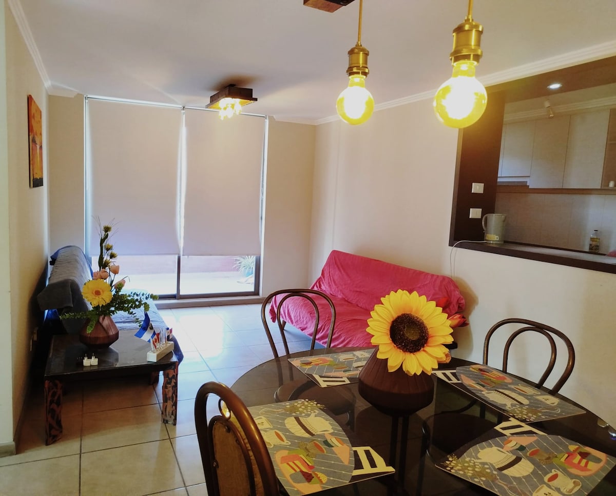 Tu familia estará cerca de todo en este alojamiento céntrico. Departamento luminoso con vista a la cordillera, ideal para tres personas. Cuenta con cama de 2 plazas, sofá cama, baño y cocina equipada. Además, tiene TV, terraza y acceso a piscina, sala de estudio y más. A solo dos cuadras del supermercado, a minutos del centro comercial y a 50 min de la capital. ¡Perfecto para una estadía cómoda y conectada!