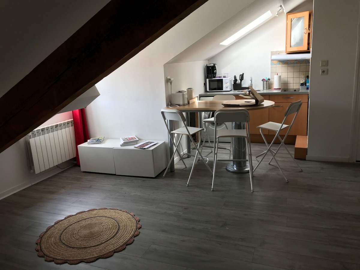 Encantador apartamento luminoso renovado en el primer piso de una casa en el fondo del patio PARA NO FUMADORES en el interior. Planta baja sala de estar de 24 m2 con cocina totalmente equipada y baño, arriba un dormitorio abuhardillado de 25 m2 con vistas a las montañas por el velux y 1 plaza de aparcamiento gratuita en nuestro patio sin vistas de la calle (3er lugar en el patio) Ayuntamiento de Tarbes a 2 km 500, Caminadour a 500 m, tienda a unos 1 km Vivimos al lado y a su disposición para satisfacer sus expectativas