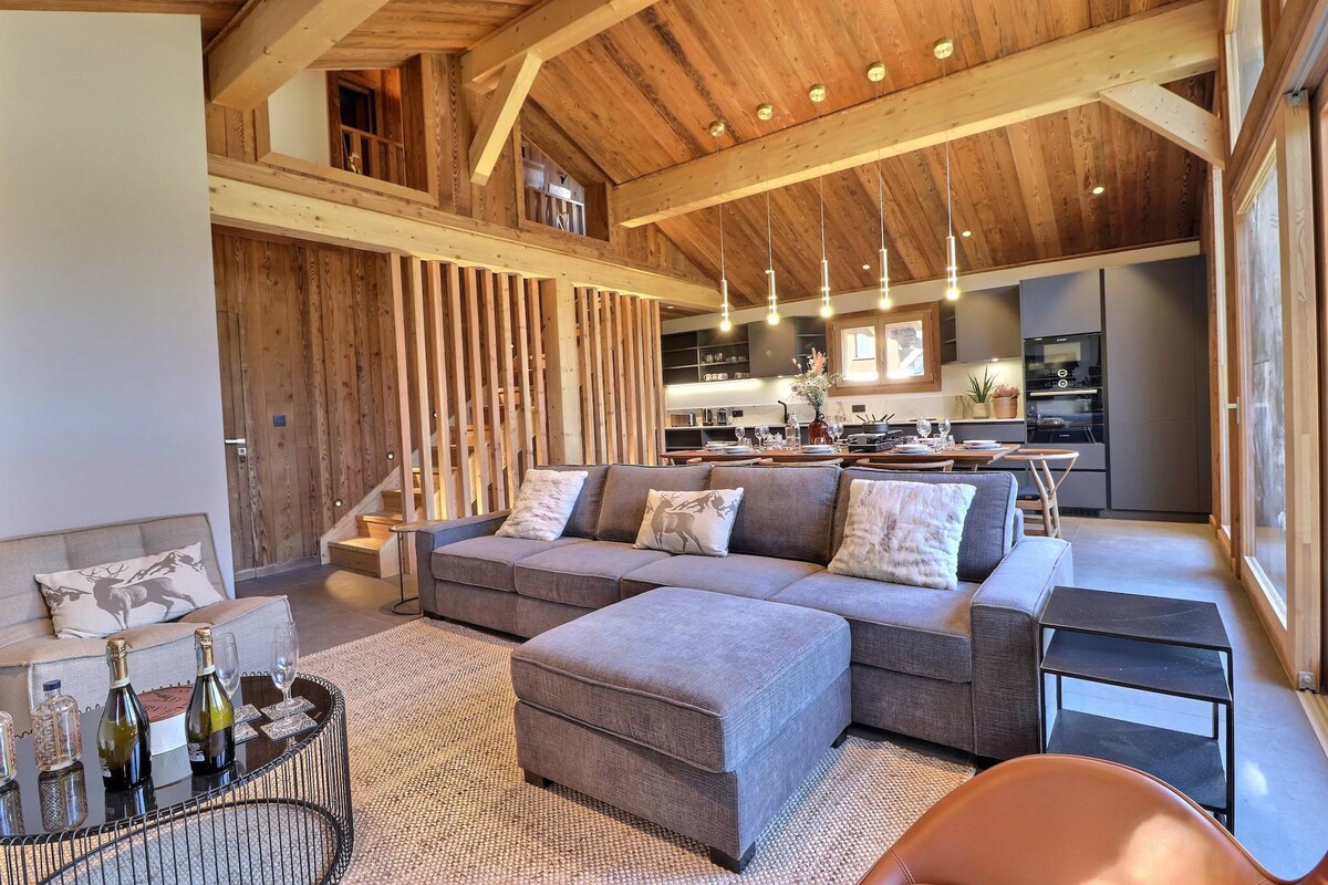 Chalet a las afueras de Morzine con acceso a las pistas de esquí de Portes du Soleil. Capacidad para 10 personas, sala de estar estilo loft, chimeneas acogedoras, vistas impresionantes, jacuzzi, sauna, 3 dormitorios de los cuales 2 habitaciones familiares.