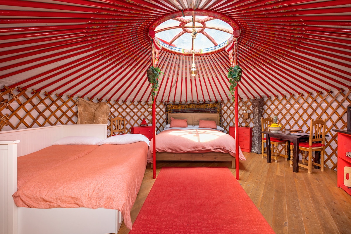 Yurta única y romántica estilo mongol, con cama doble y sofá cama. Cocina básica con placa de inducción, hervidor, cafetera italiana y Nespresso Dolce Gusto, utensilios y mesa con sillas. En invierno: estufa de gas y radiador; en verano: aire acondicionado. Baño privado a pocos pasos con ducha. Wi-Fi, piscina y zonas comunes compartidas. Vistas espectaculares a Sierra Nevada. Ideal para desconectar.