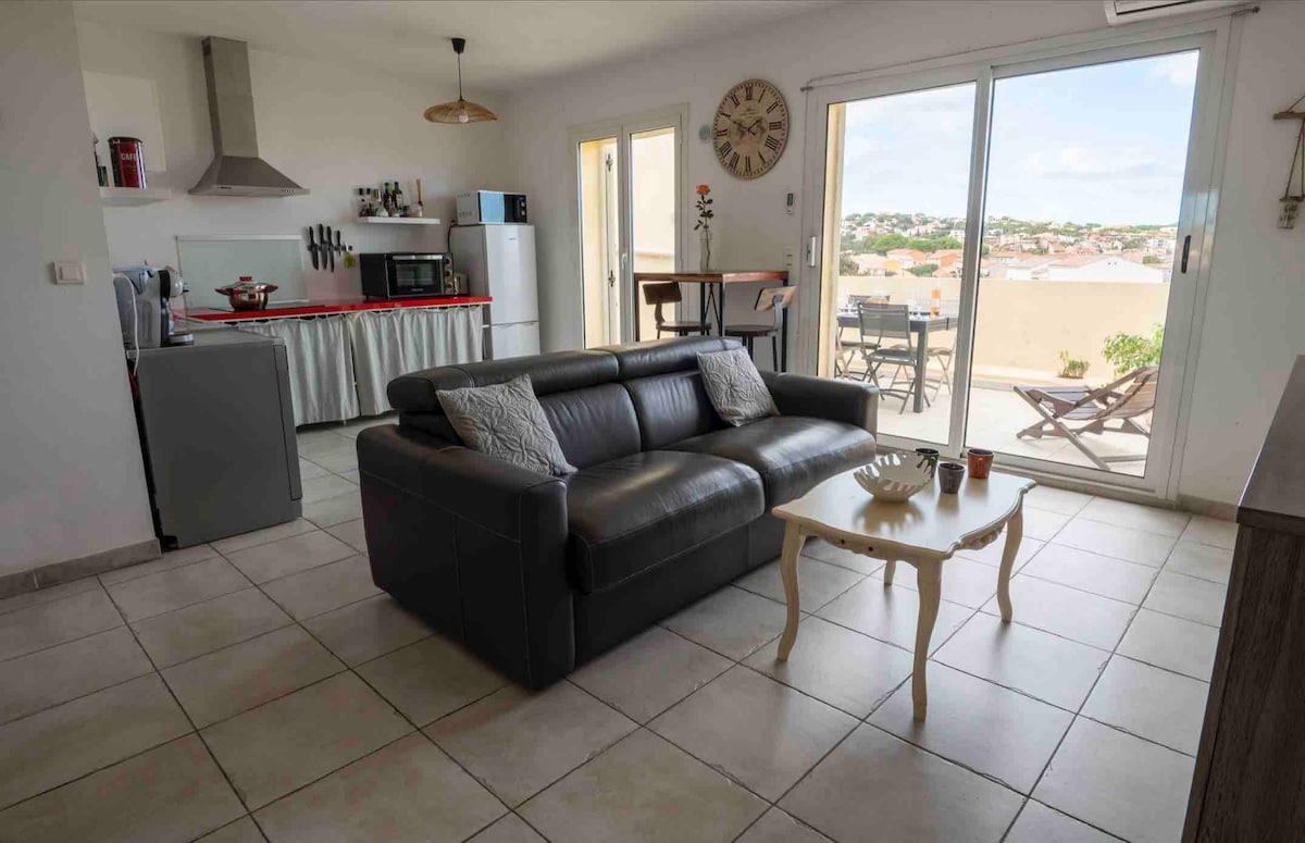 T2 cerca de la playa con terraza, piscina, aire acondicionado, estacionamiento