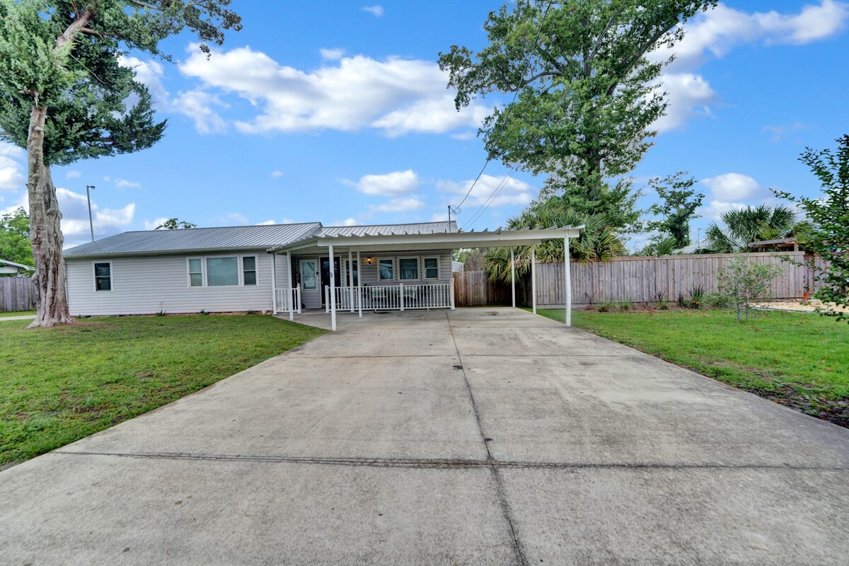 ☀ 5 min easy walk to beach ☀ Walk to restaurants, fast food, stores ☀ Dogs welcome with pet fee ☀ Centrally located and quiet neighborhood ☀ Minutes to Pier Park and and Frank Brown Park ☀ Fenced yard with hot tub, fire pit, picnic area, cornhole Perfect for snowbirds, families, couples or small groups who want plenty to do after spending their day at the beach Sleeps 6: Bedroom 1: King + Twin-Size Trundle Bed (pull out) + En Suite Bath Bedroom 2: Queen Living Room: Twin-Size Pull-Out Chair
