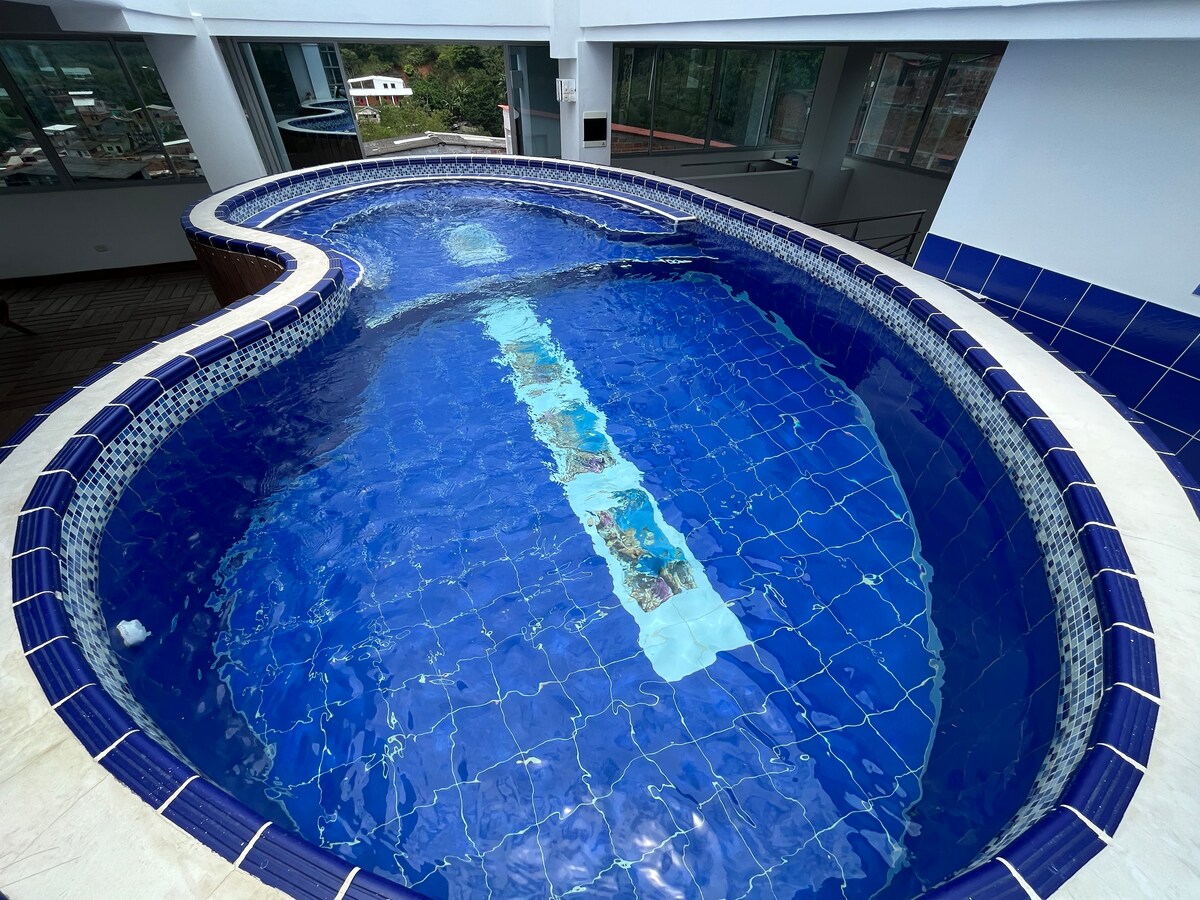 Disfruta de una vista excepcional en este apartamento moderno, a 2 cuadras del parque principal de San Rafael, fresco y cómodo. Cuenta con dos habitaciones (una cama doble y una semidoble), sala, comedor, cocina totalmente equipada, dos baños con agua caliente, ventiladores y zona de ropas. Ideal para descansar y sentirte como en casa, rodeado de naturaleza y comodidad. A 10min aproximadamente en transporte de ríos