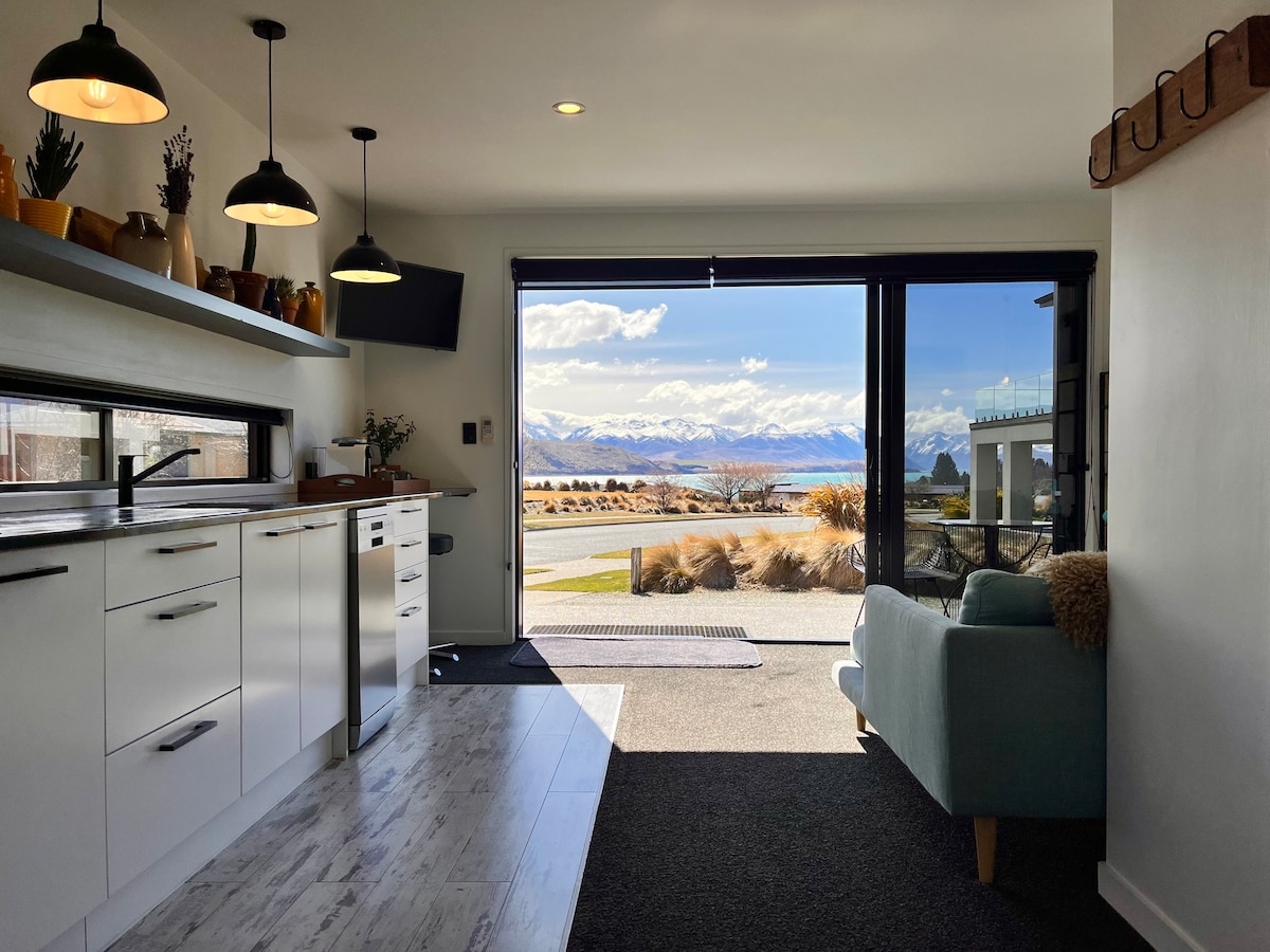 Disfruta de impresionantes vistas a la montaña y al lago desde una nueva villa moderna en el lago Tekapo. Una de las dos villas situadas dentro de una gran propiedad, la casa es privada y pacífica. • Grandes ventanales y balcón para maximizar la vista de las montañas y las estrellas. • Cocina totalmente equipada con estufa de gas. • Televisión inteligente extragrande con Netflix y Neon • Lavadora y secadora en el lugar • Amplio estacionamiento en el lugar • Mucho espacio verde - A tres minutos a pie de cafeterías, restaurantes, bares. - A cinco minutos a pie del lago y de la iglesia.