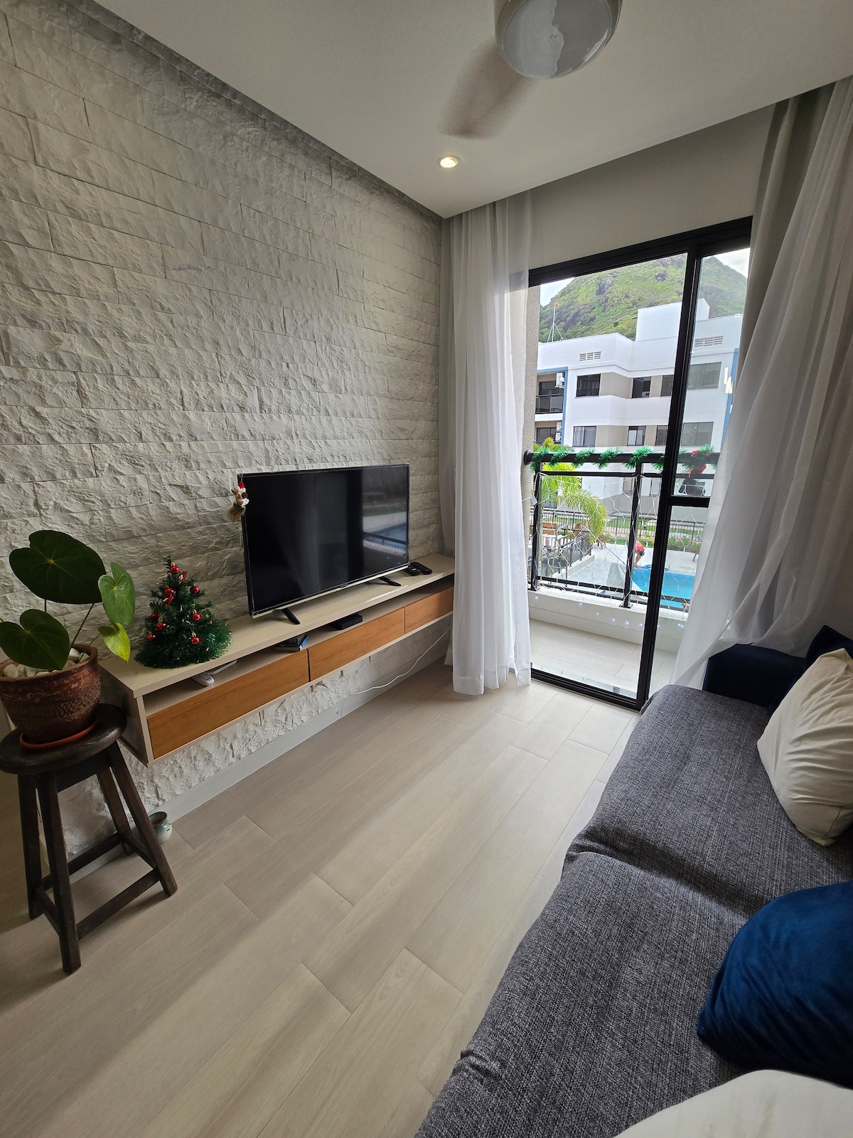 Encantador apartamento de 1 dormitorio y sala de estar en el 2.º piso, con dos balcones: 1 en el dormitorio con vistas a la carretera Pontal y el otro en la sala de estar con vistas parciales al mar. Wifi rápido y un pequeño rincón genial para aquellos que necesitan trabajar. Ideal para parejas, familias o incluso aquellos que vienen por trabajo. Incluye ropa de cama/baño. Si necesitas un intercambio, solo tienes que organizarlo (servicio adicional). Ofrecemos sillas de playa, sombrillas y toallas de playa. * Apartamento autónomo sin relación comercial o comercial con el condominio